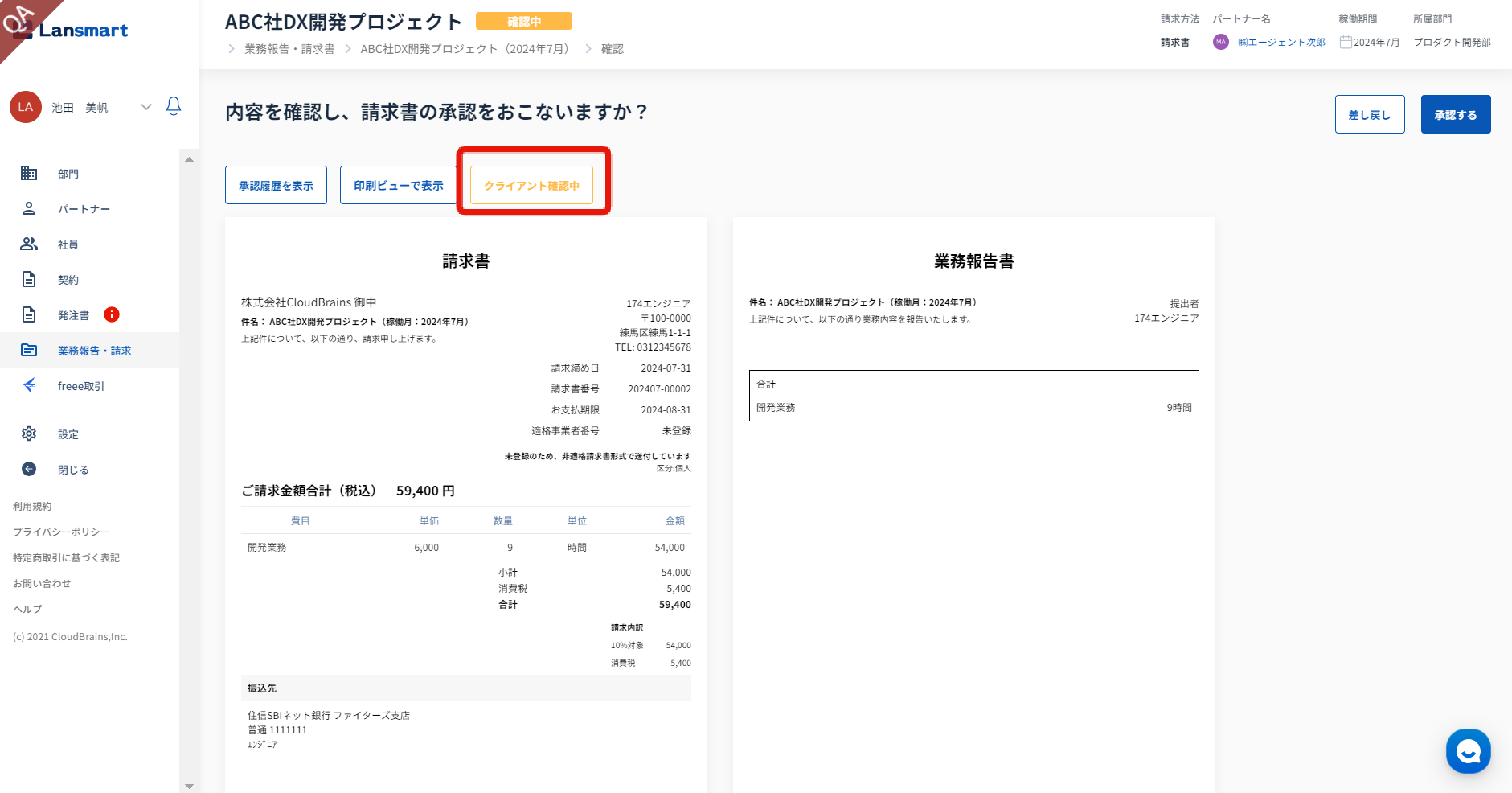 また、クライアント確認ステータスが「確認中」でも、請求書を差し戻し/承認することは可能です。