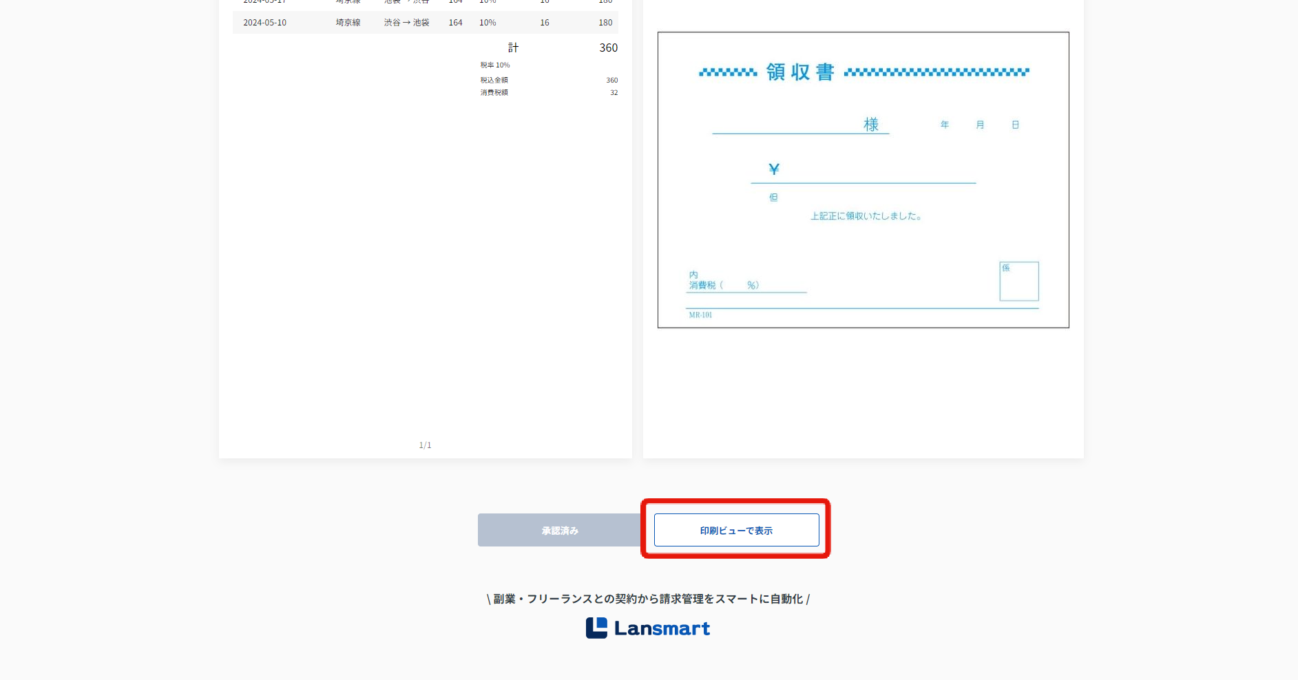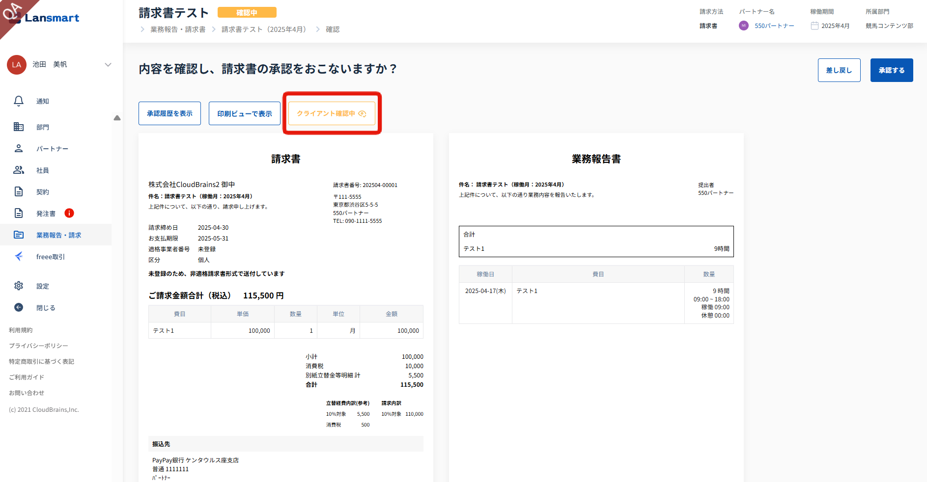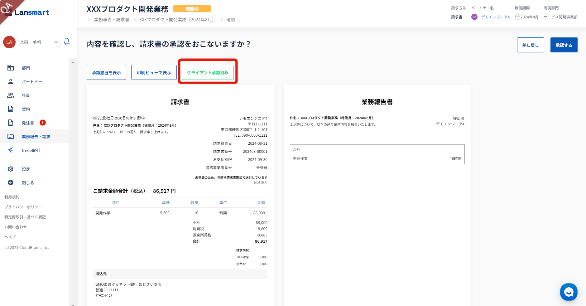 「実行する」ボタンを押しますと、業務報告書が承認され、クライアントの確認画面では「承認済み」と表示されます。また、「印刷ビューボタン」からPDF保存することができます。
