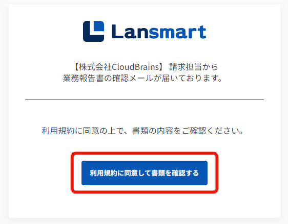 メール本文のURLをクリックすると、下記の画面が表示されます。「利用規約に同意して書類を確認する」ボタンを押してください。