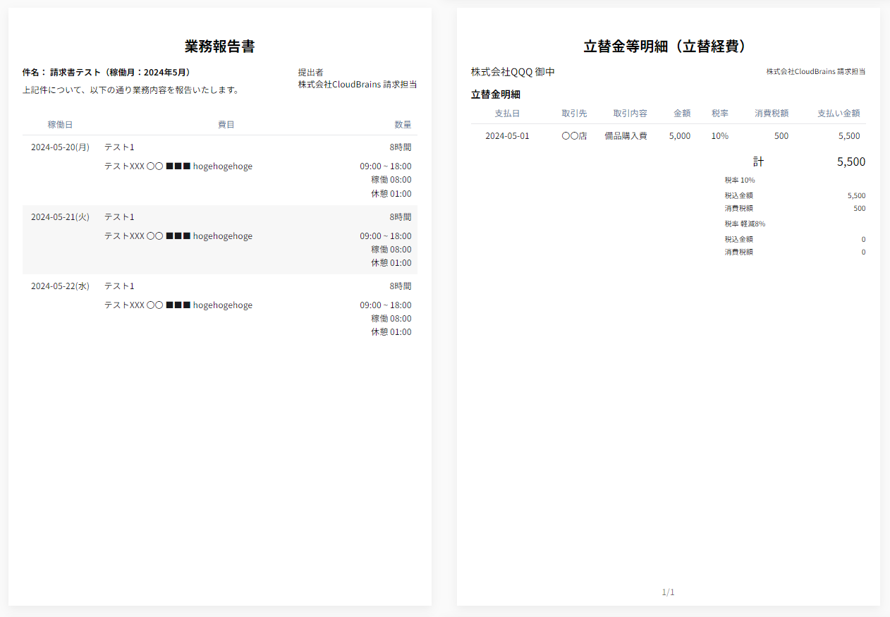 パートナー様が請求書を作成する際に立替経費・交通費を入力されていて、クライアントへの業務報告書確認メール送付時の設定で業務報告書の確認メールに含めるに☑をしている場合は、立替金等明細、領収書も表示されます。