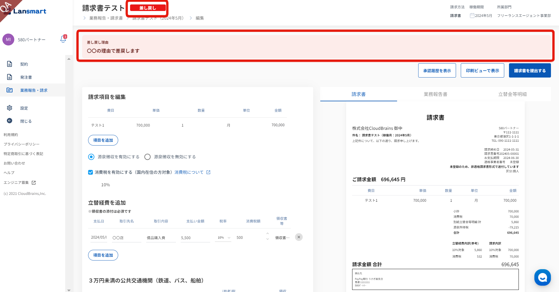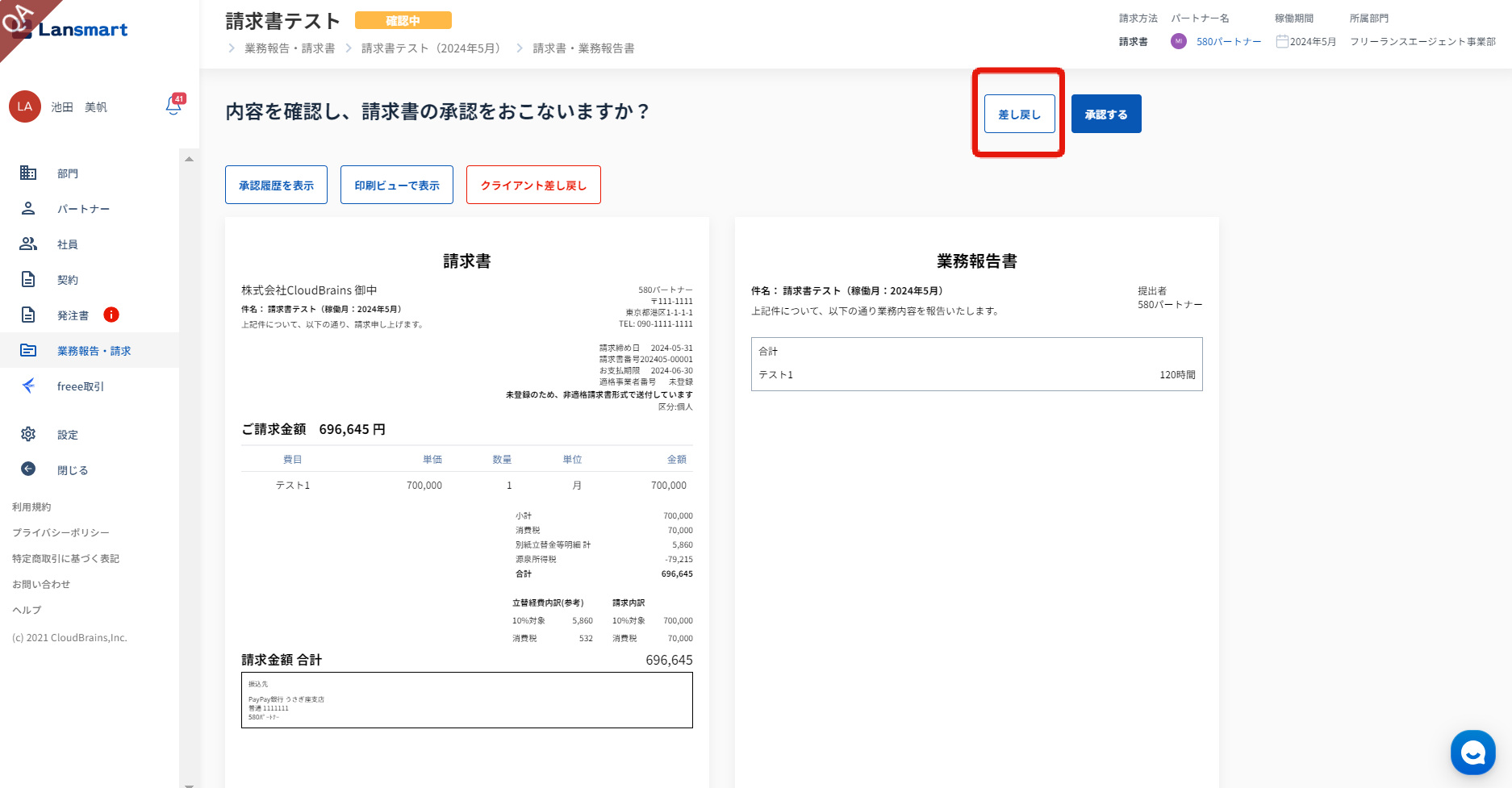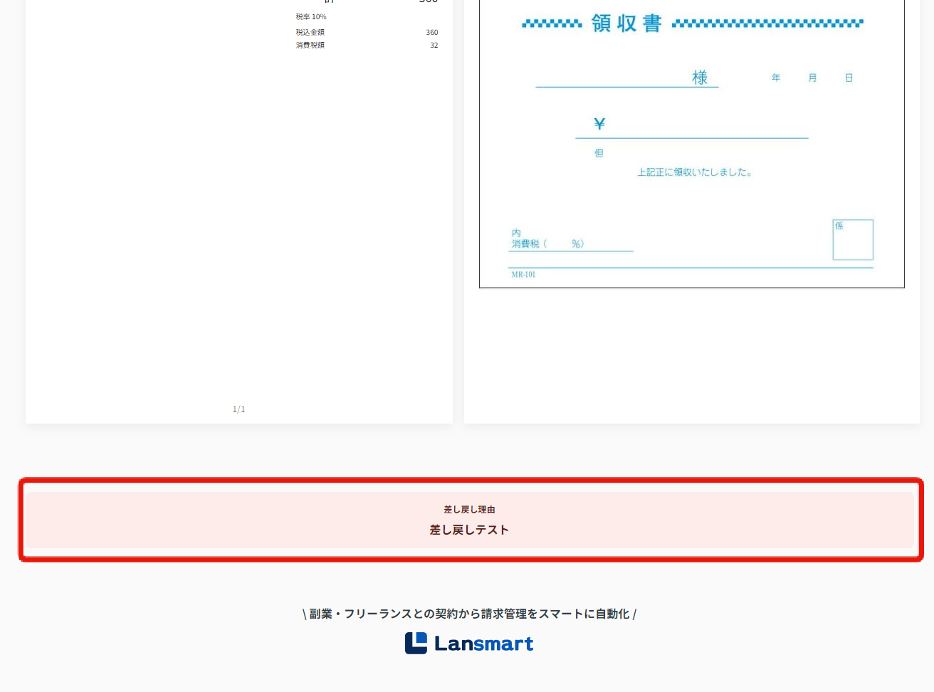 請求書確認画面では、「差し戻し」ステータスと表示され、差し戻し理由が確認できます。