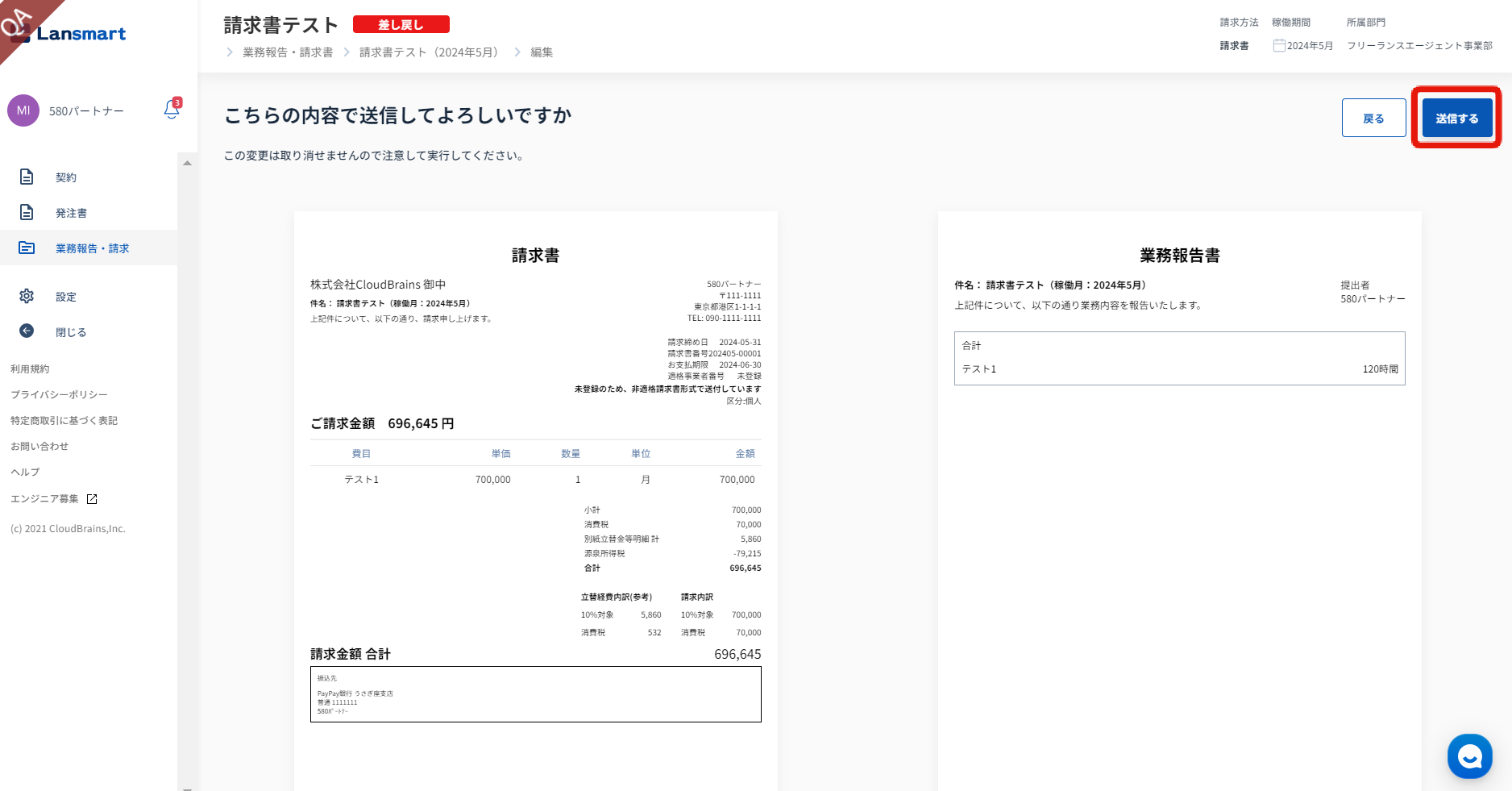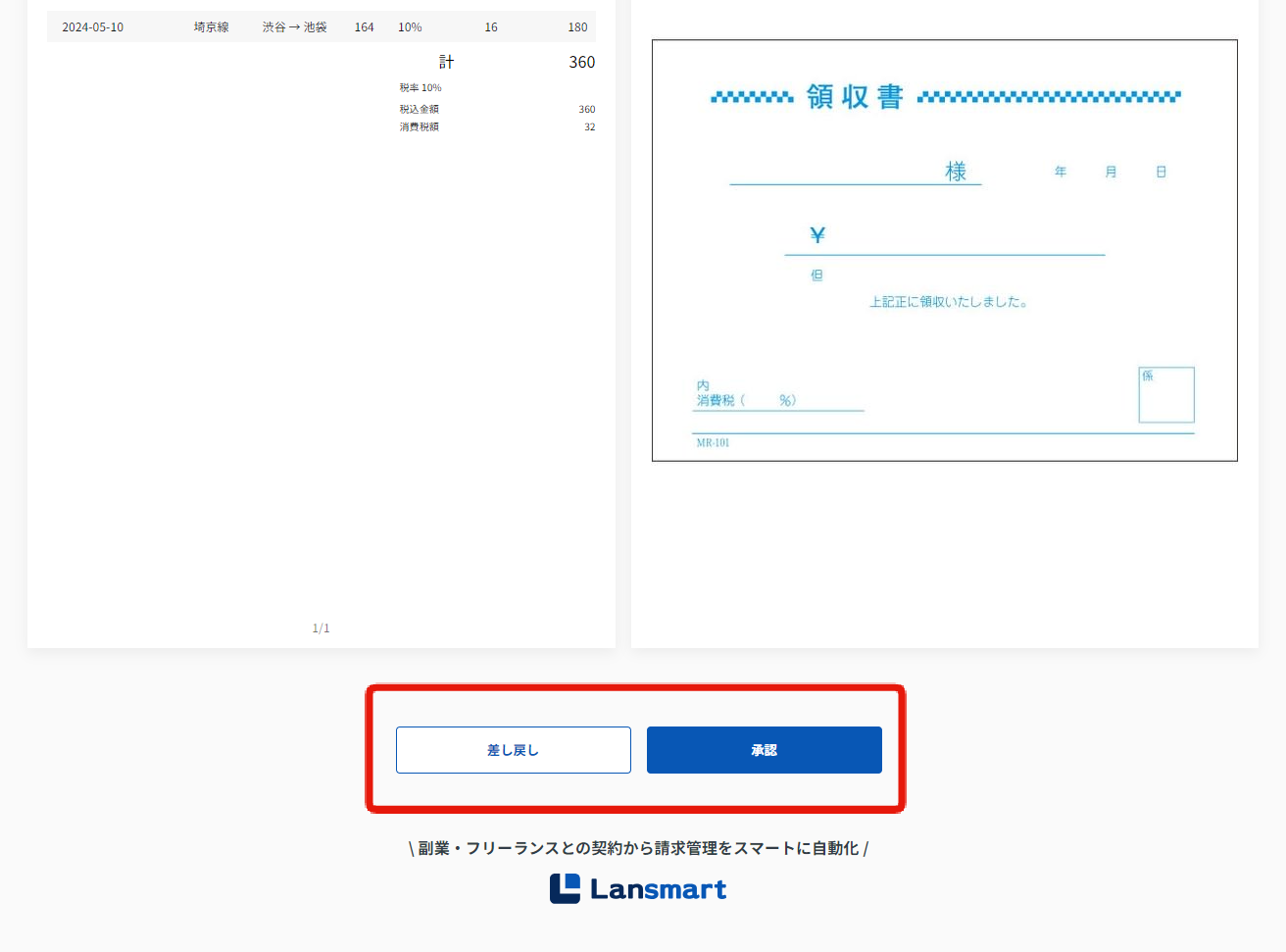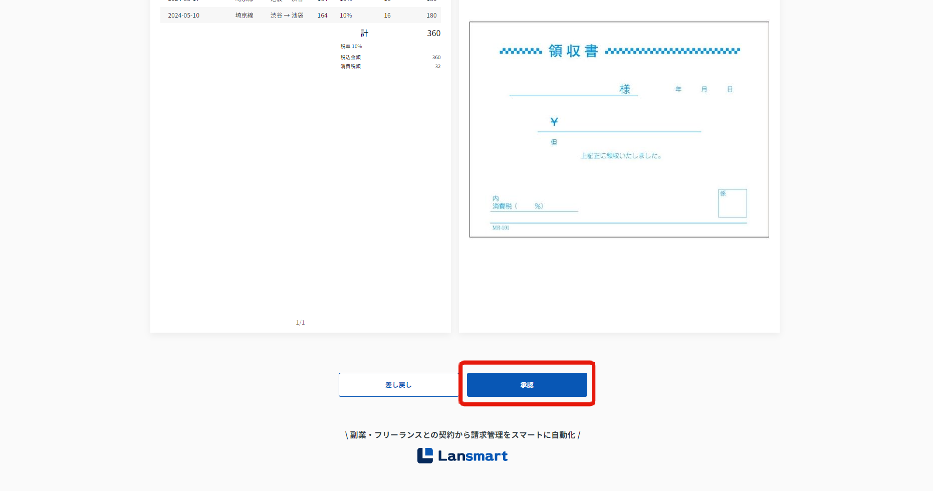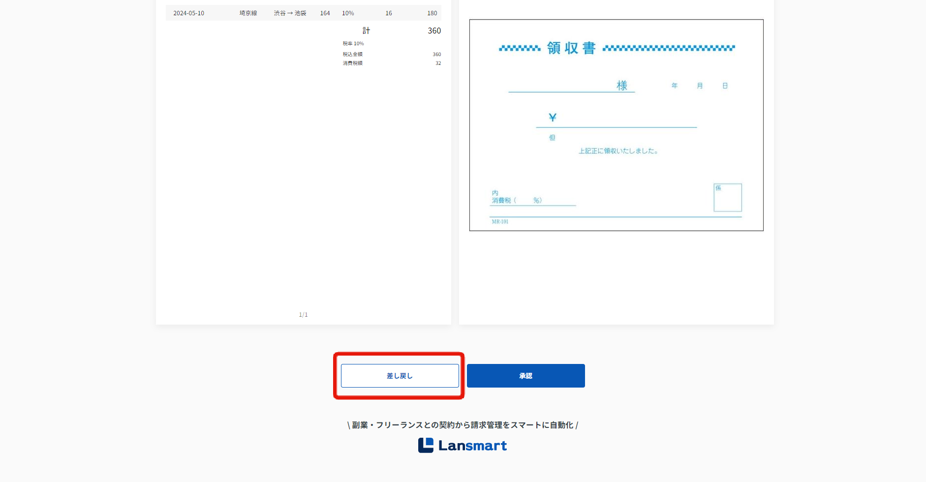 請求書確認画面では、「差し戻し」ステータスと表示され、差し戻し理由が確認できます。