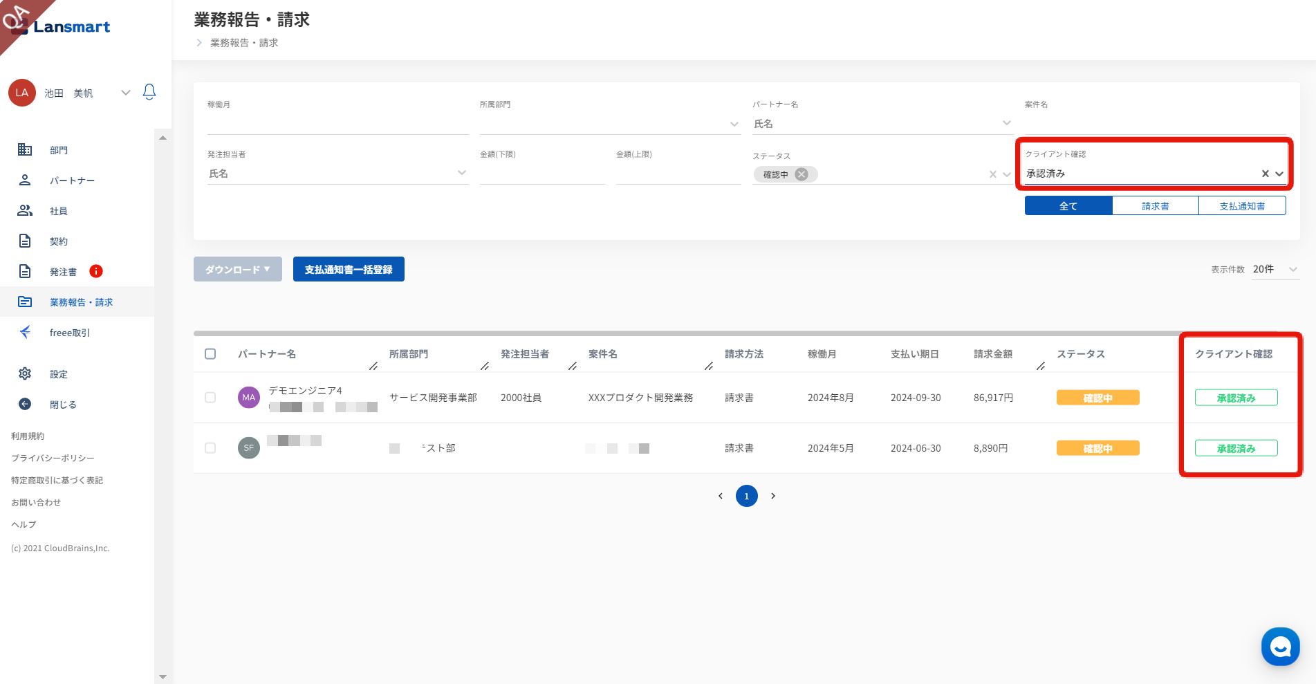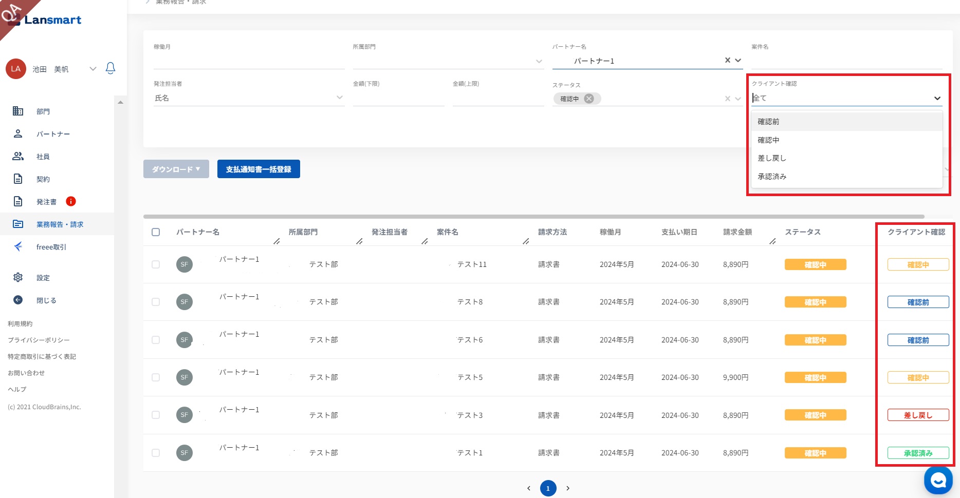 業務報告・請求一覧にて、クライアント確認のステータスを確認することができます。フィルタをかけることもできます。