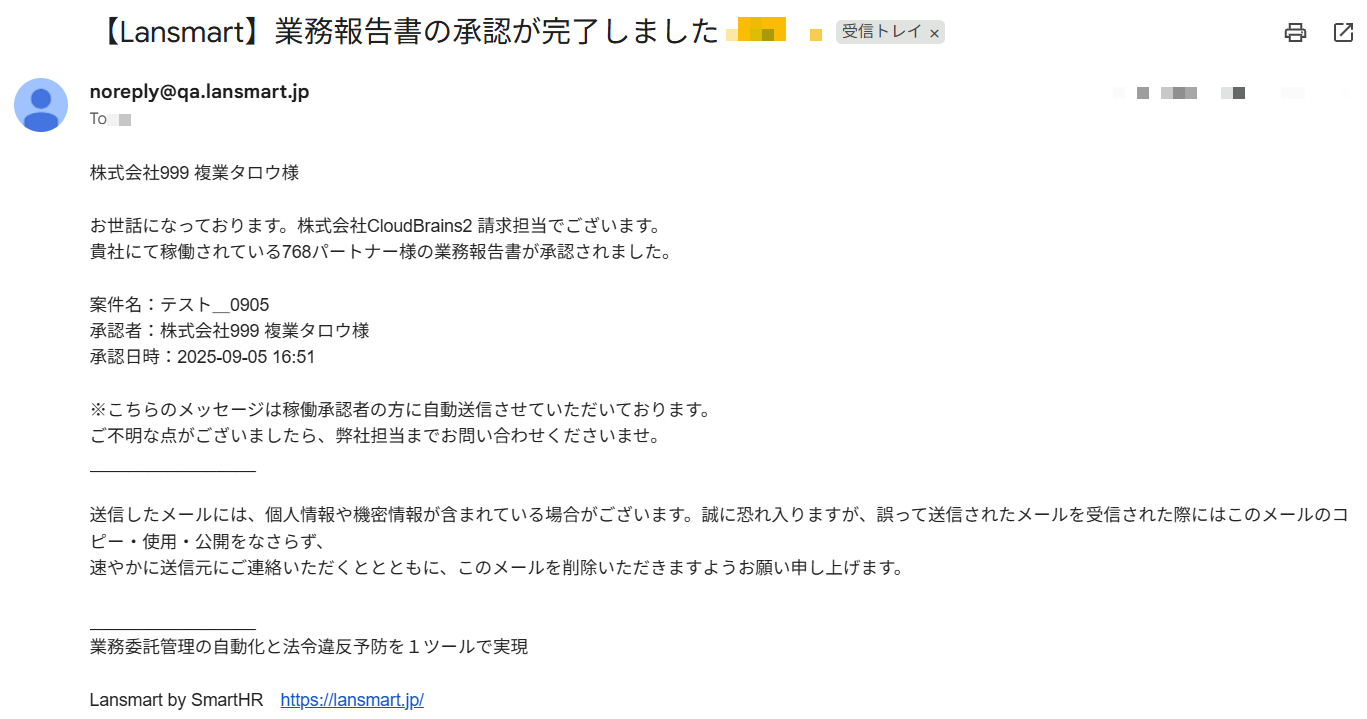 クライアント様が業務報告書を承認されますと、クライアント様に承認完了のメールが通知されます。