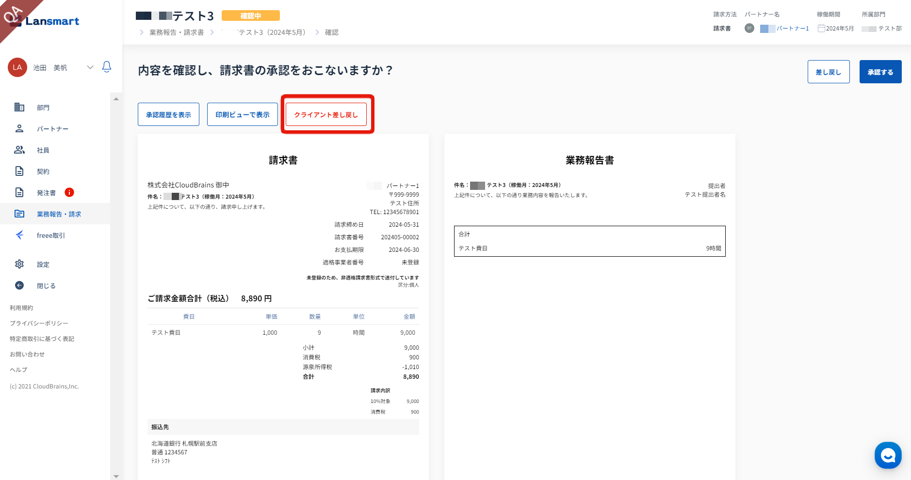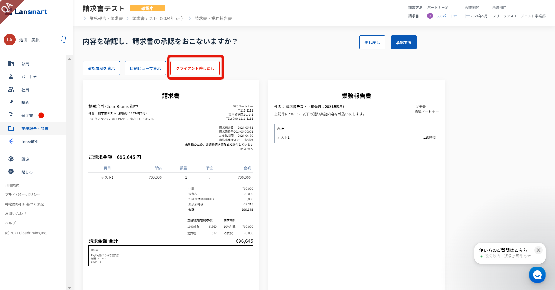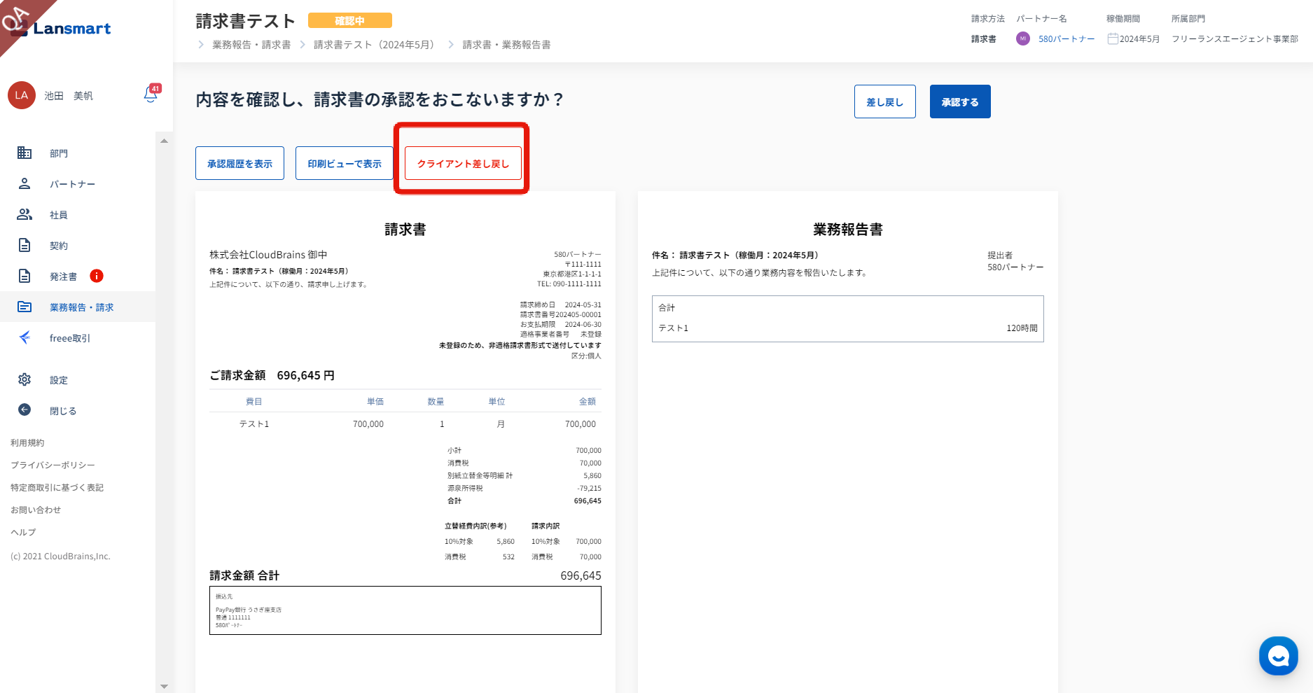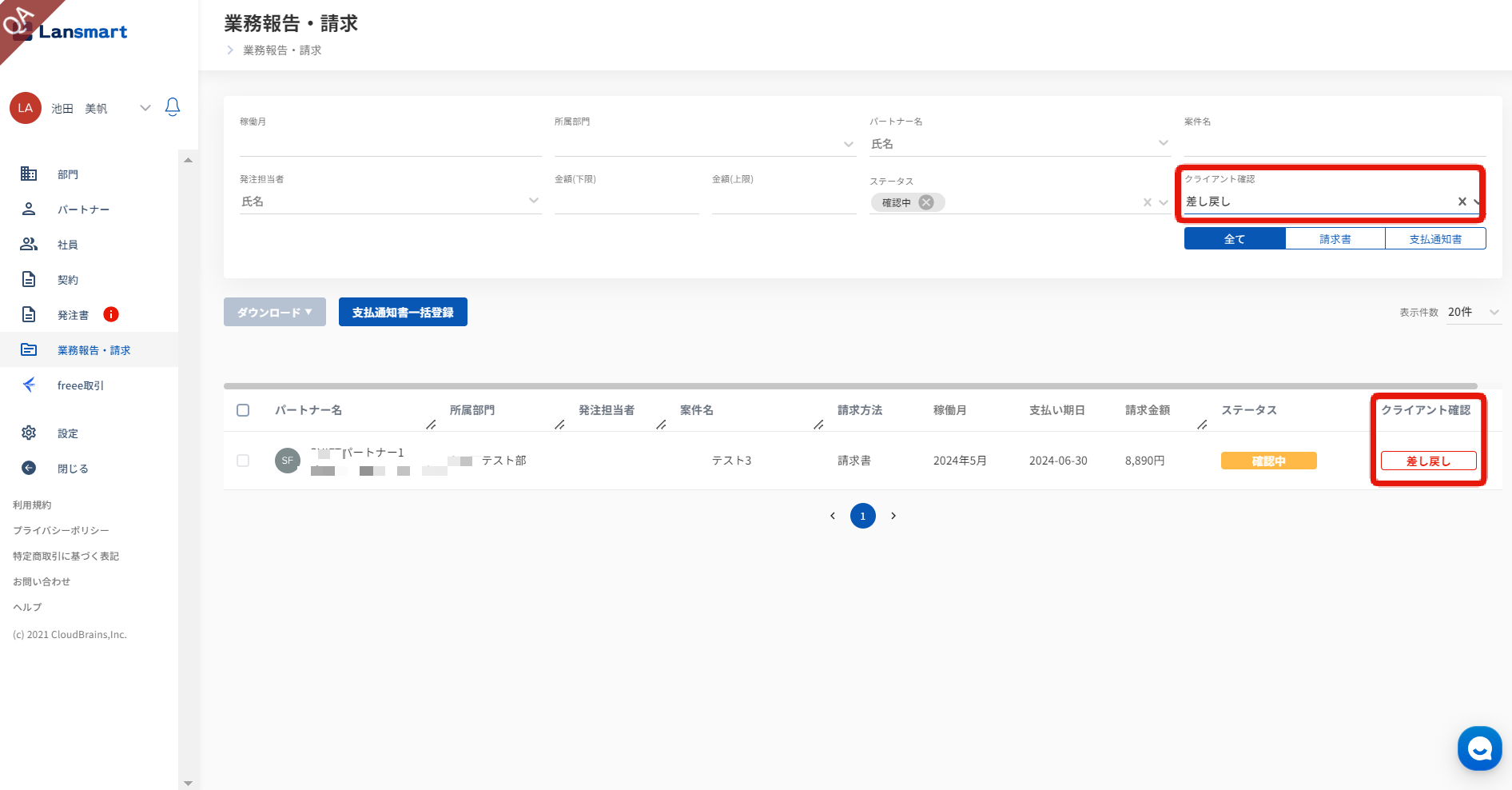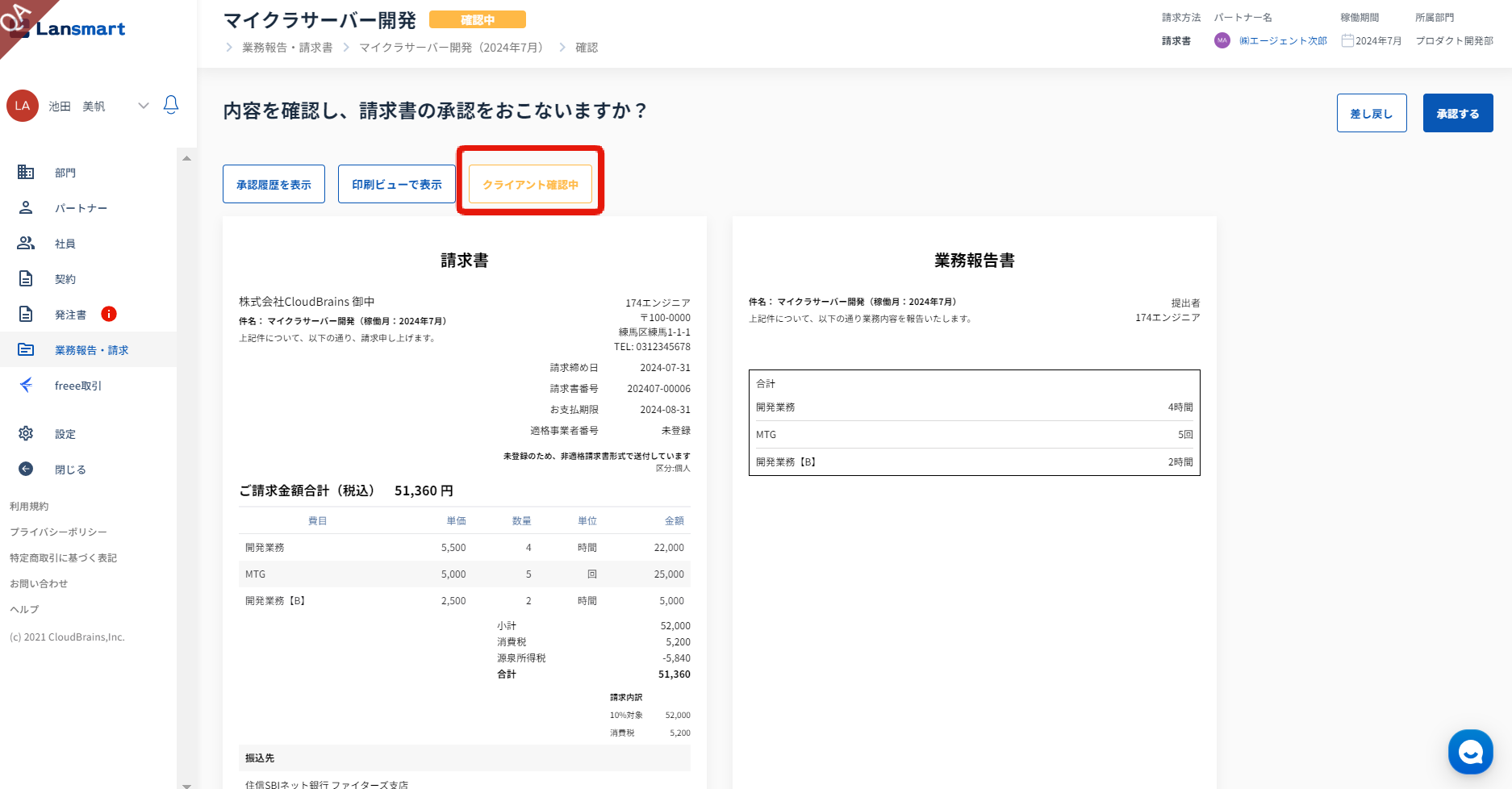 請求書確認画面では、「クライアント差し戻し」と表示されます。差し戻し理由は、「クライアント差し戻し」をクリックし、履歴内で確認できます。