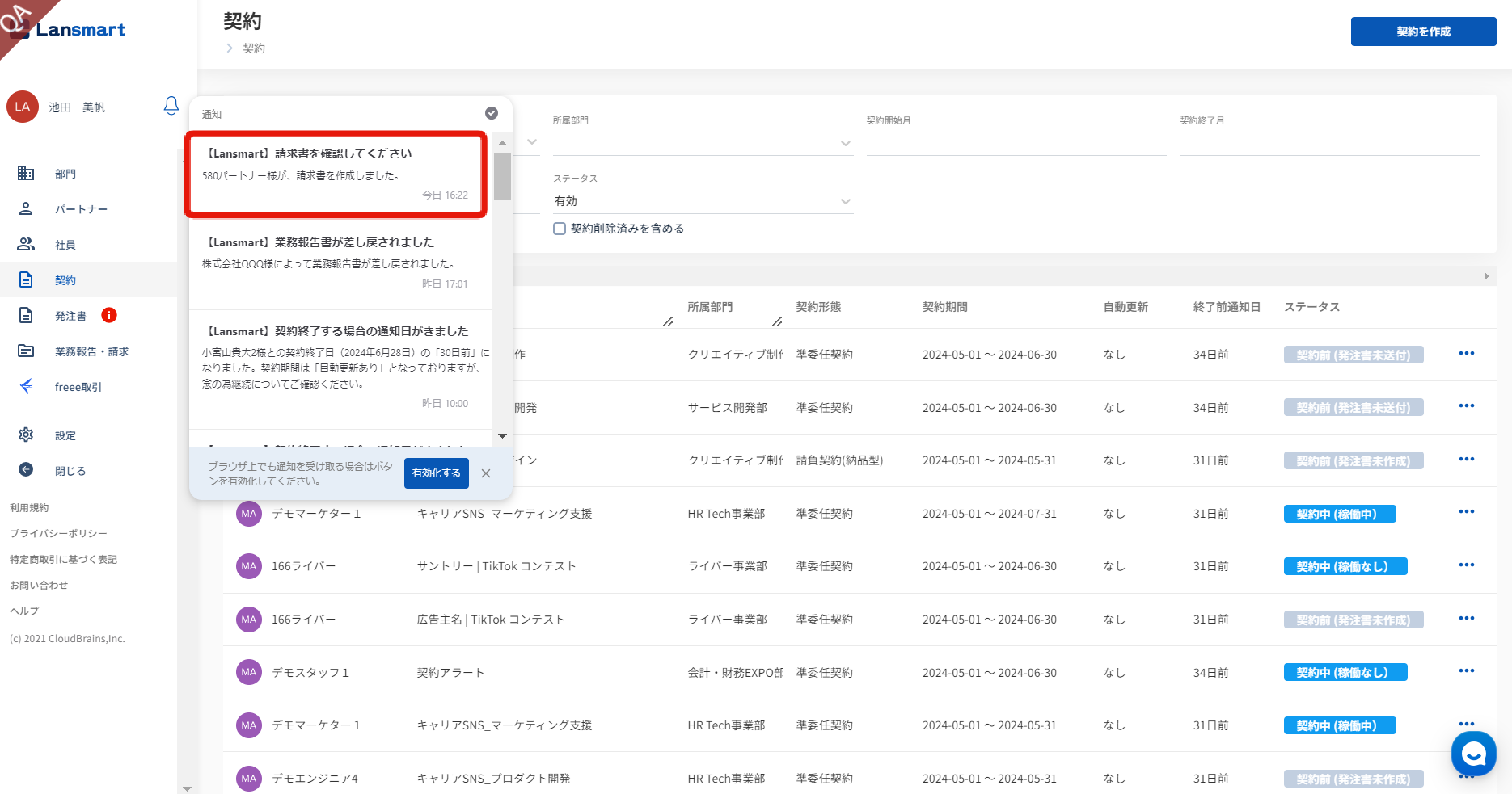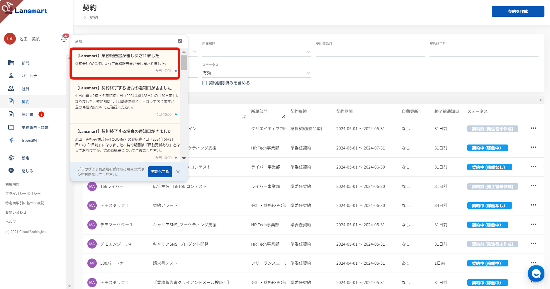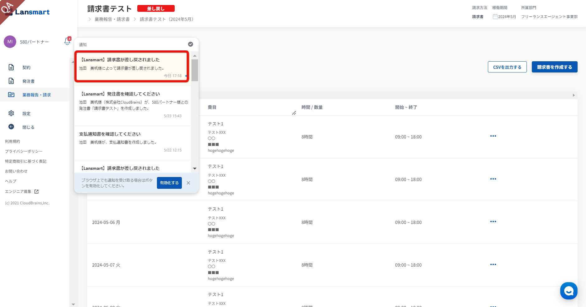 パートナー様が請求書・業務報告書を再提出されましたら、企業様に通知があります。