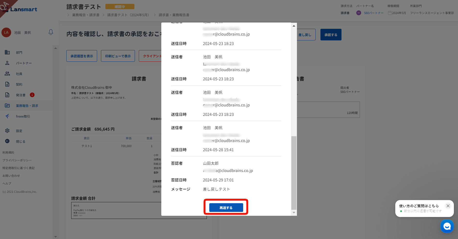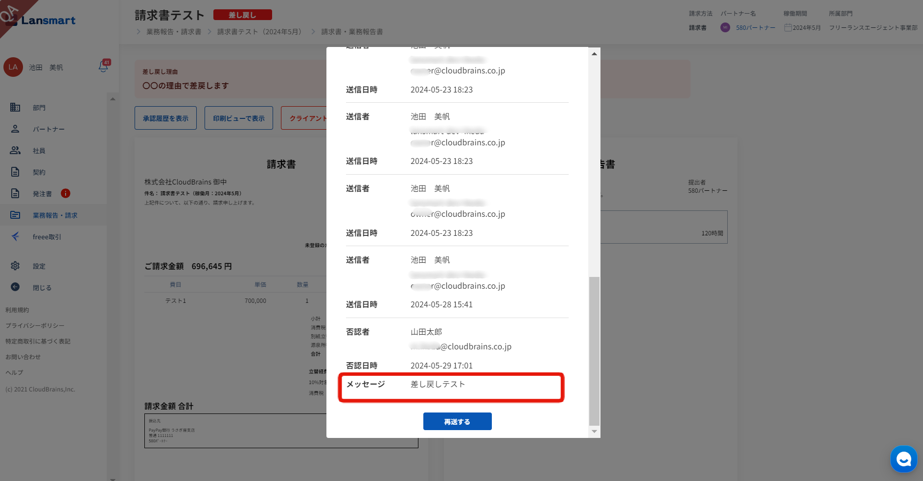 請求書確認画面の「クライアント差し戻し」をクリックし、下部の「再送する」ボタンを押します。