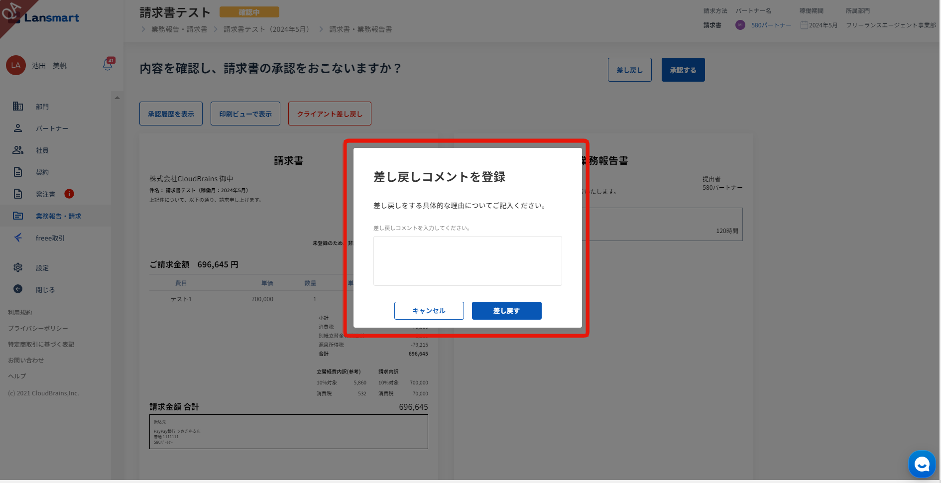 請求書画面右の「差し戻し」ボタンを押し、パートナーへの請求書を差し戻してください。差し戻し時には、理由をコメントしてください。