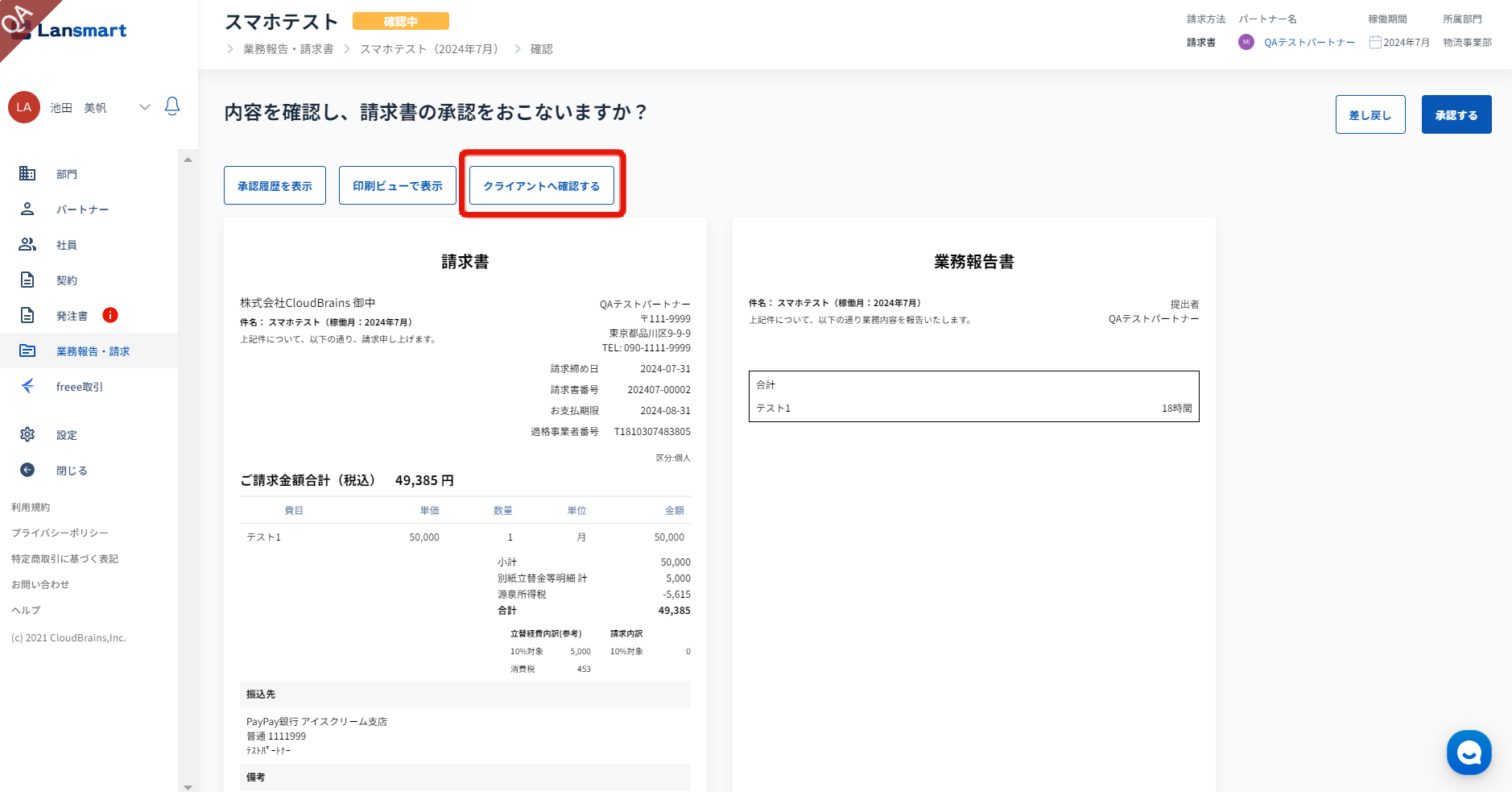 請求書確認画面にて「クライアントに確認する」ボタンをクリックします。