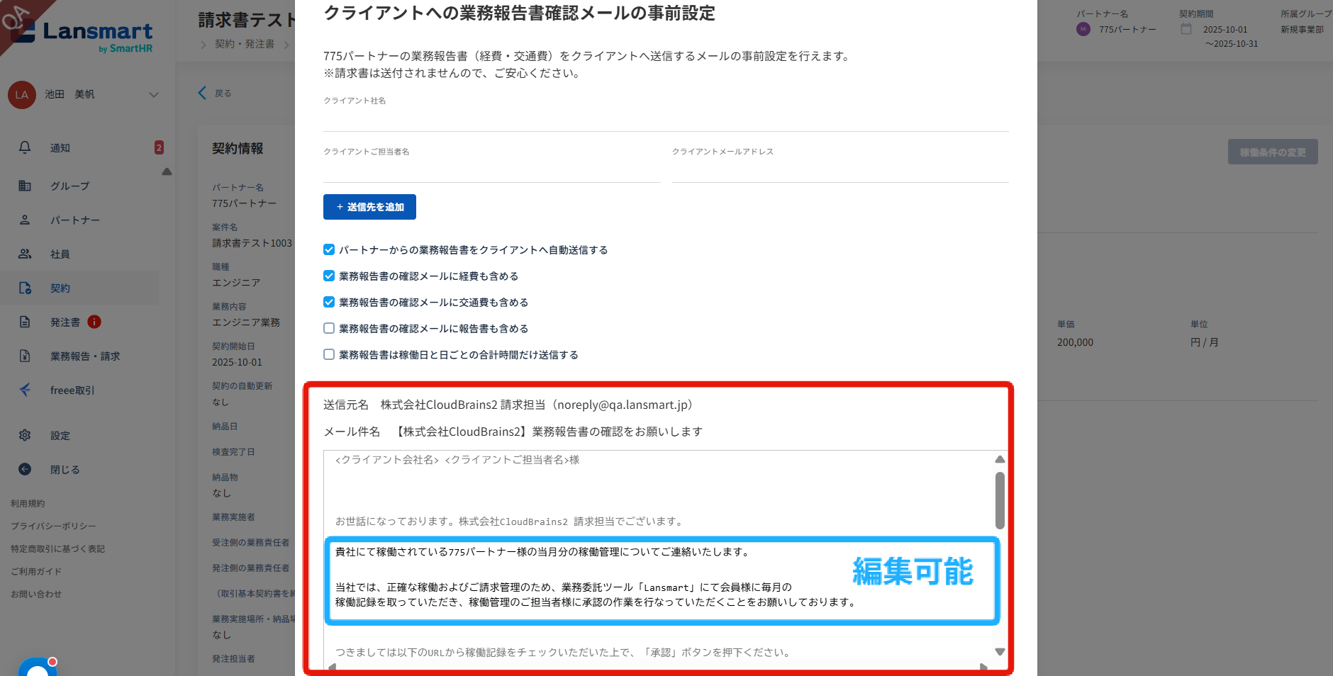 自動送付設定とは、パートナー様が請求書を提出すると、業務報告書(立替経費・交通費含む)がクライアントに自動送付されるようにする設定です。
