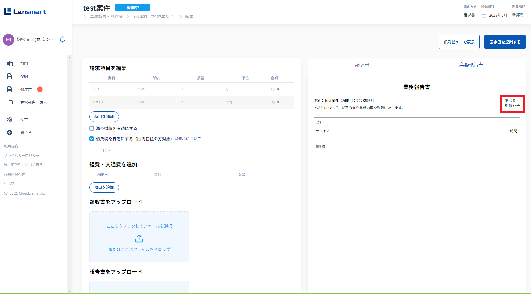請求書作成画面を開き、「基本情報を編集」の項目の一番下「業務報告書提出者名」の欄を編集してください。(デフォルトではユーザー名が入力されています)