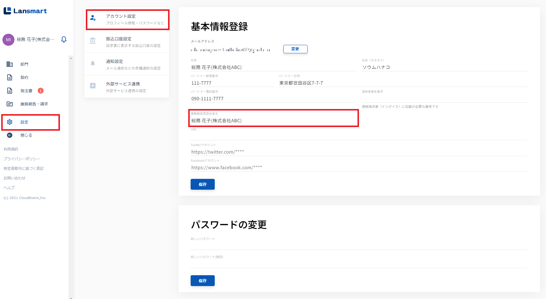 左メニュー「設定」をクリックし、「アカウント設定」を開き、「業務報告書提出者名」の欄を編集してください。(デフォルトではユーザー名が入力されています)