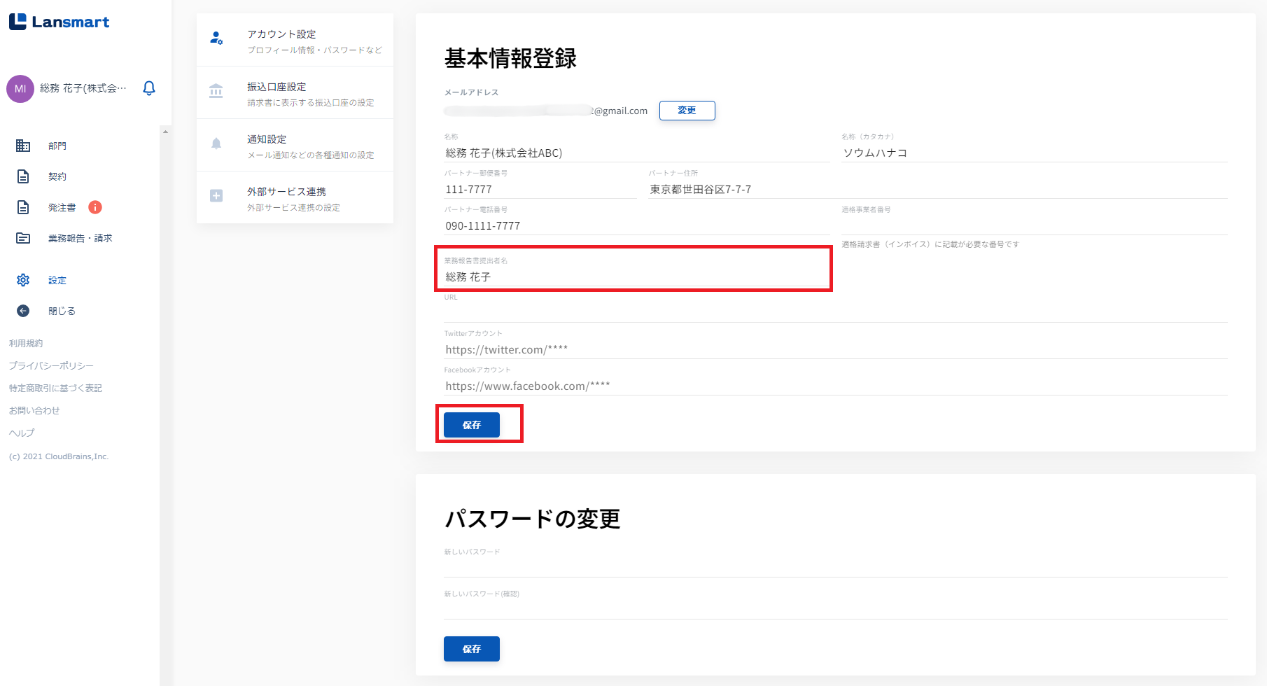 「保存」ボタンを押すと、設定が完了します。(請求書作成画面の「基本情報を編集」の項目の一番下「業務報告書提出者名」の欄には、設定した内容が反映されます。)