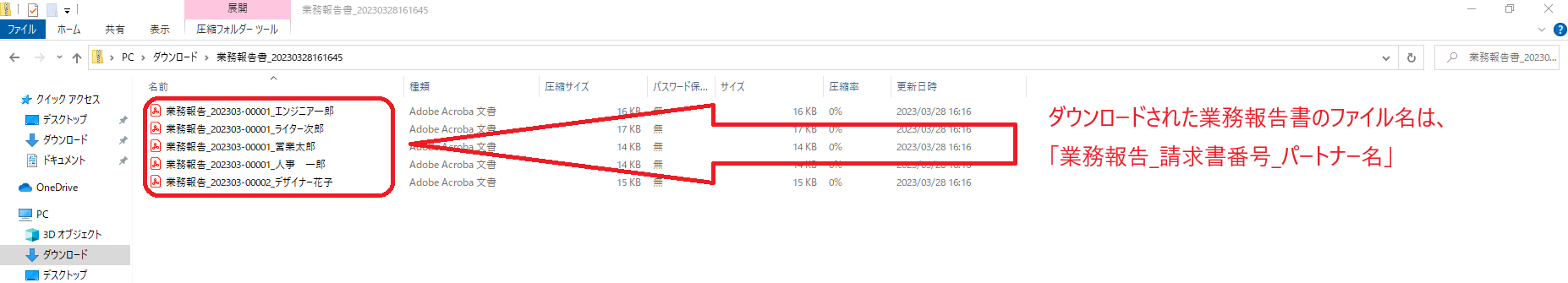 ダウンロードされた業務報告書のファイル名:「業務報告書_請求番号_パートナー名」