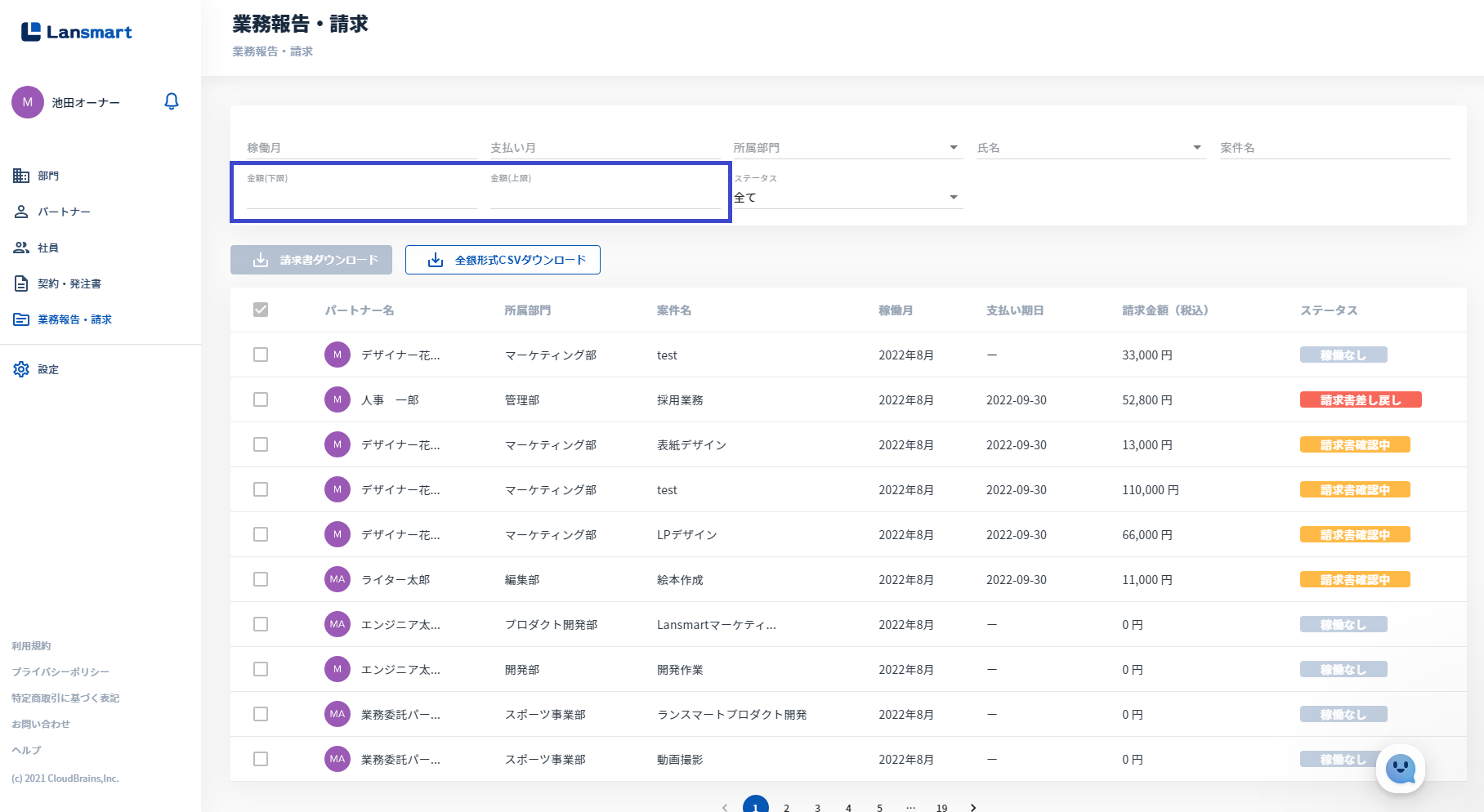 発注書一覧・請求書一覧にて、金額で検索するフィルタがございます。(改正電子帳簿保存法適応のため) 改正電子帳簿保存法の詳細は、こちらをご参照くださいませ。電子帳簿保存法関係については、こちら。ソート機能もございます。動画をご参照くださいませ。 ※支払い期日のソートについては、期日が入っているものが上位表示されて並べ替えされ、「ー」になっているものはソートすると下位に表示されます。
