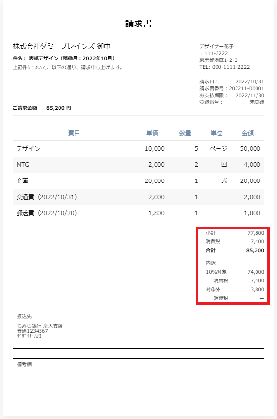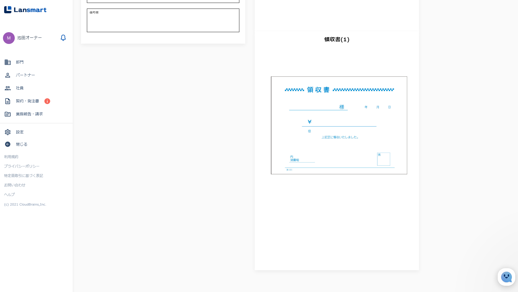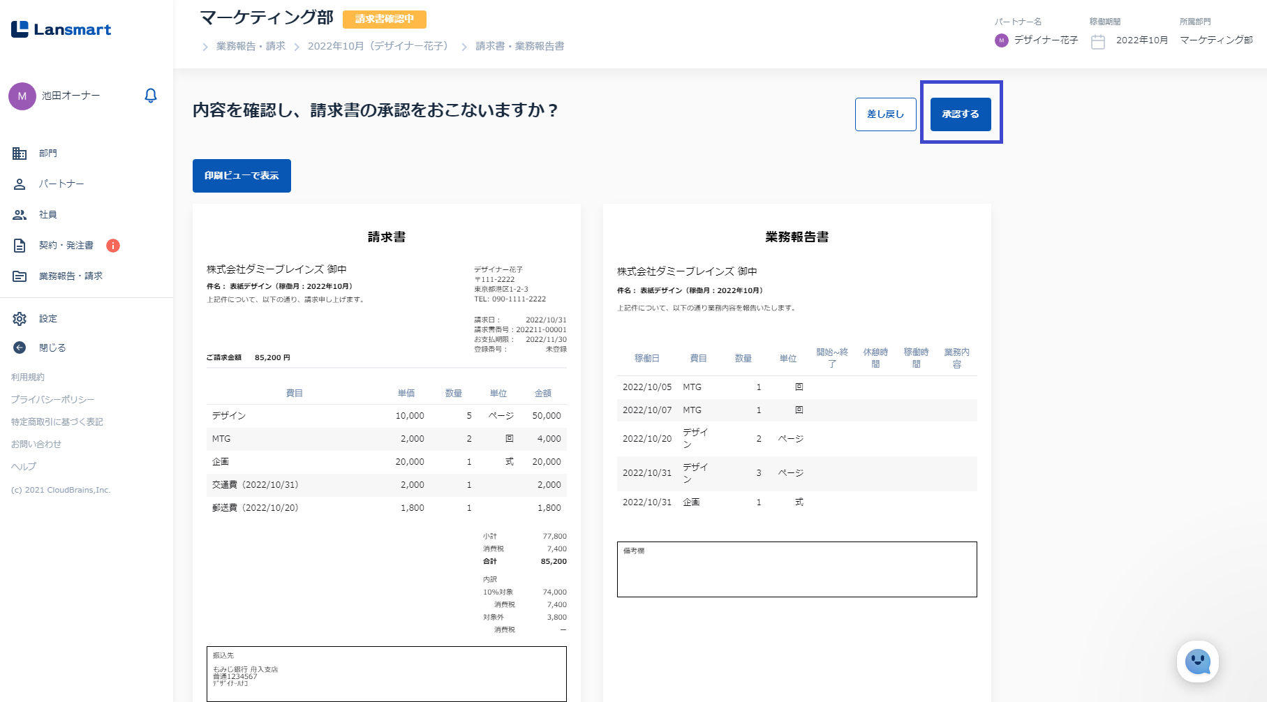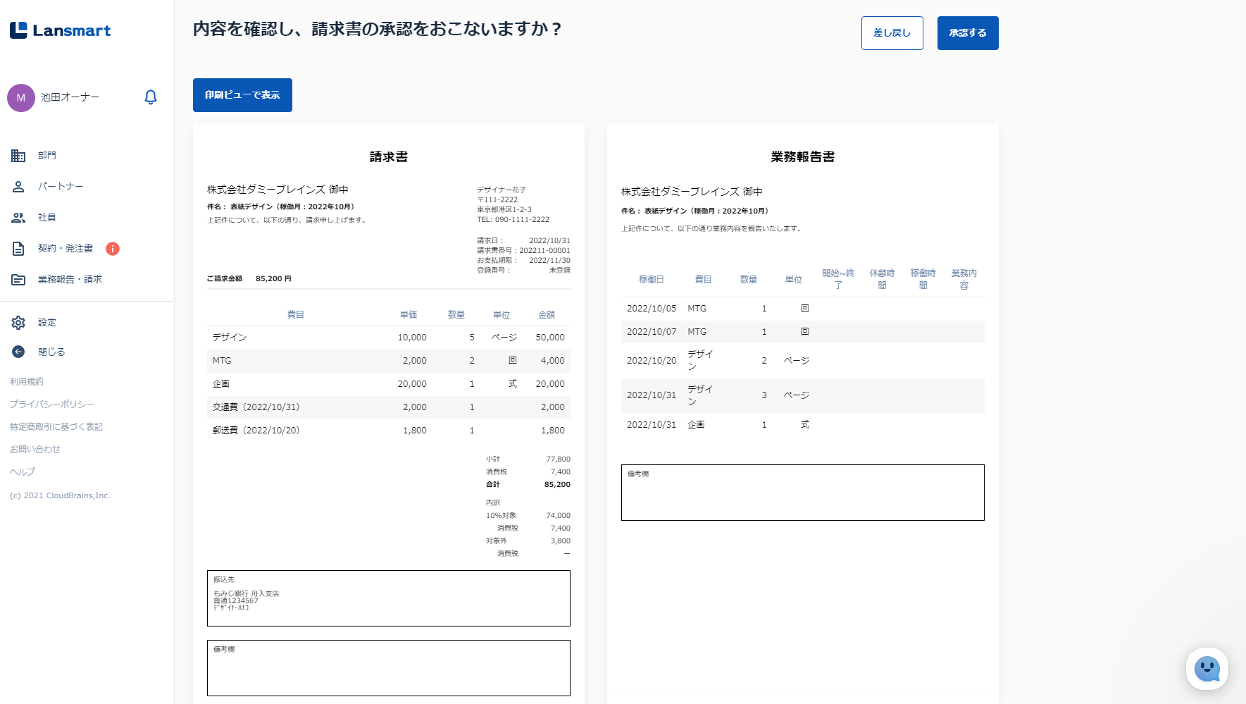 請求書承認画面にて、業務報告時間と請求書の金額の確認を行います。(パートナー様が領収書を添付した場合は、領収書も表示されます。) 請求書の金額の内訳表記はインボイス制度に適応しています。