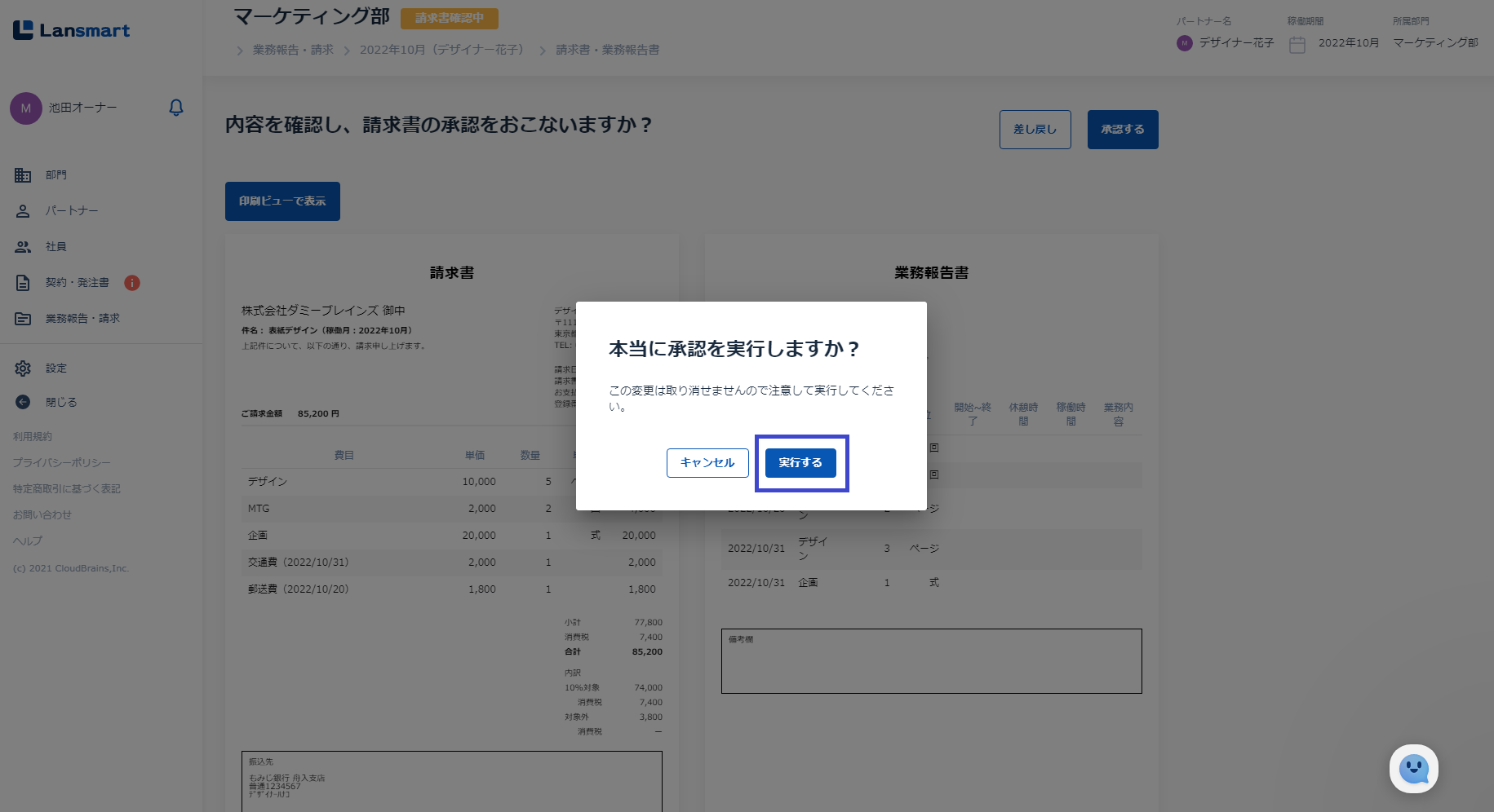 承認の最終確認ダイアログが表示されますので、「実行する」ボタンを押します。