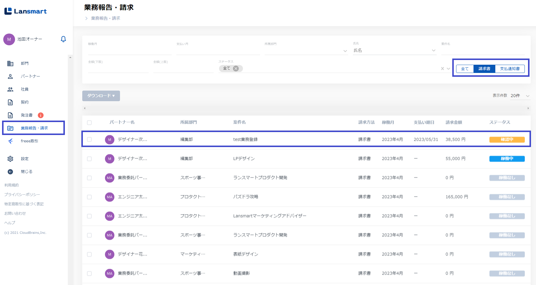 左メニューの「業務報告」をクリックし、右上のタブを「請求書」に切り替え、一覧に表示されている当月の請求対象パートナーのステータスが「確認中」になっているものをクリックします。
