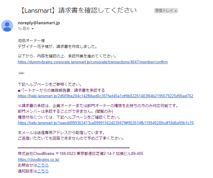 パートナーから業務報告・請求書が提出されると、件名「【Lansmart】請求書を確認してください」という通知メールが届きます。