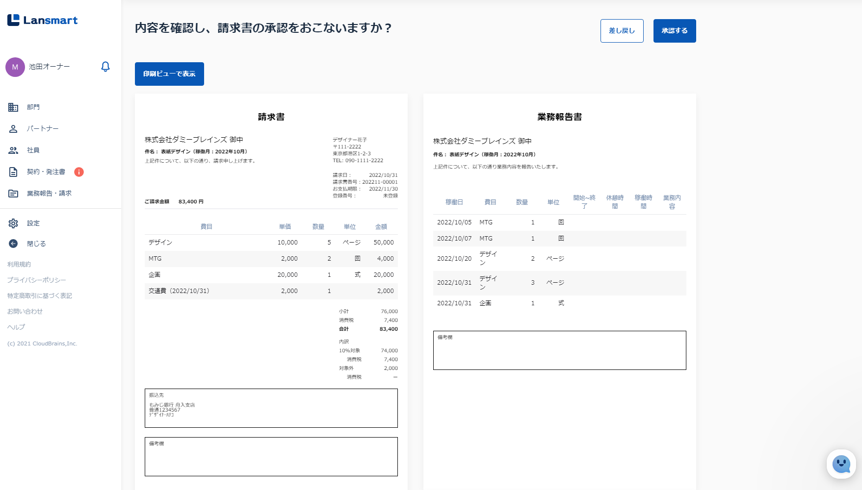 なお、Lansmart by SmartHRでは、パートナーが入力した作業登録から、業務報告書と請求書を自動生成できるため、パートナーの方の業務報告・請求書作成の手間を大幅に削減することが可能です(特許取得済み)。