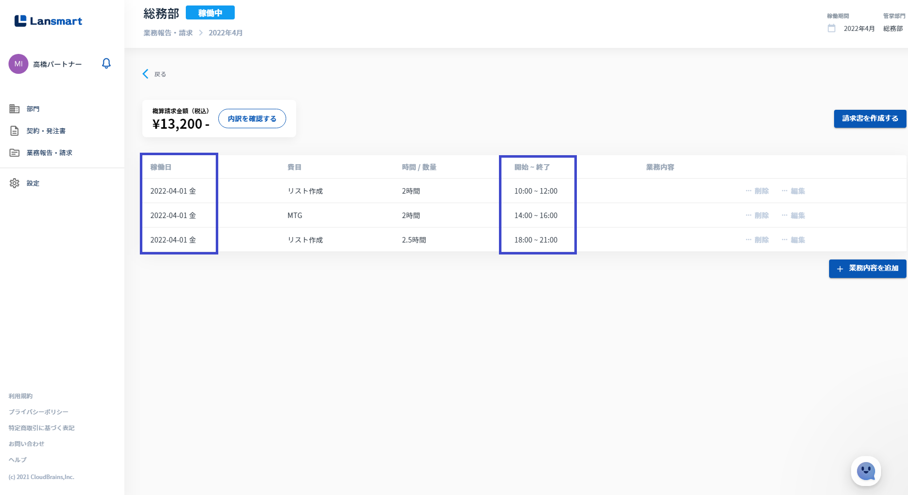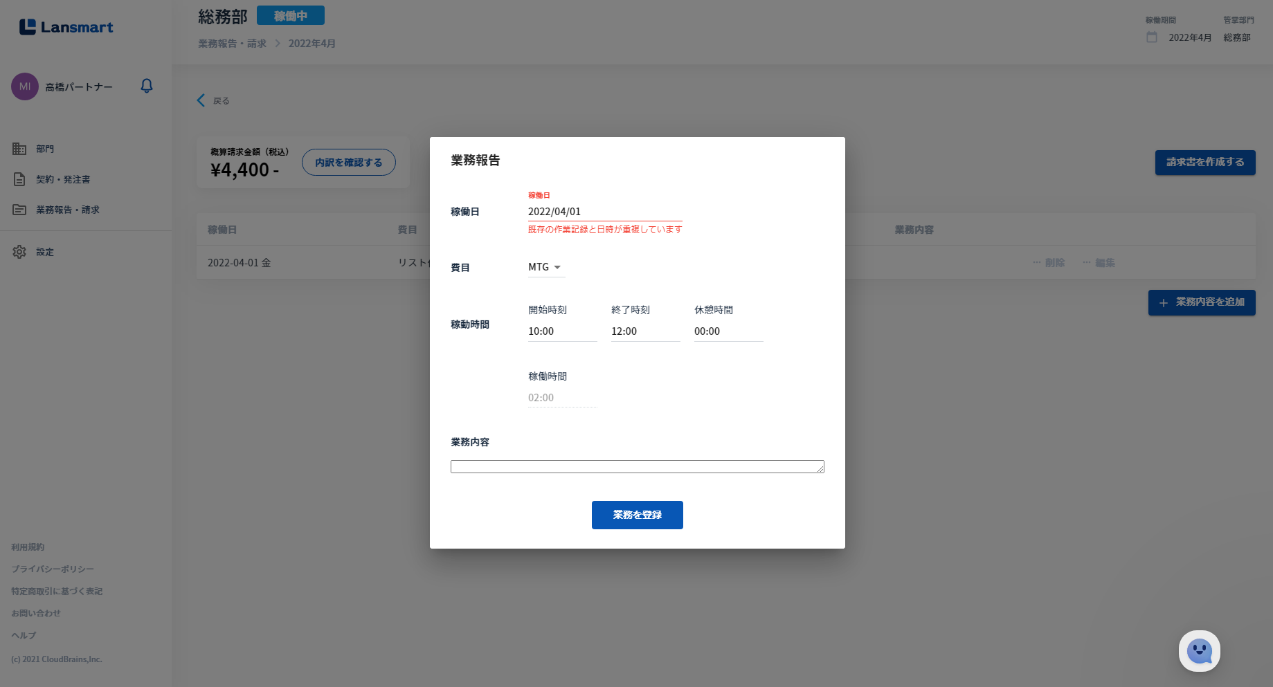 同日同時間帯では、業務登録できないように制限がかかっております。(異なる費目の場合でも、同日同時間帯は登録することができません。) 稼働時間が重ならないように入力していただければ同じ日付でも登録することができます。 例)●●の費目で4/1 10:00-12:00で登録があった場合は、4/1は10:00-12:00以外の稼働時間であれば登録することができます。(4/1 14:00-16:00など)関連ガイド業務登録を行う