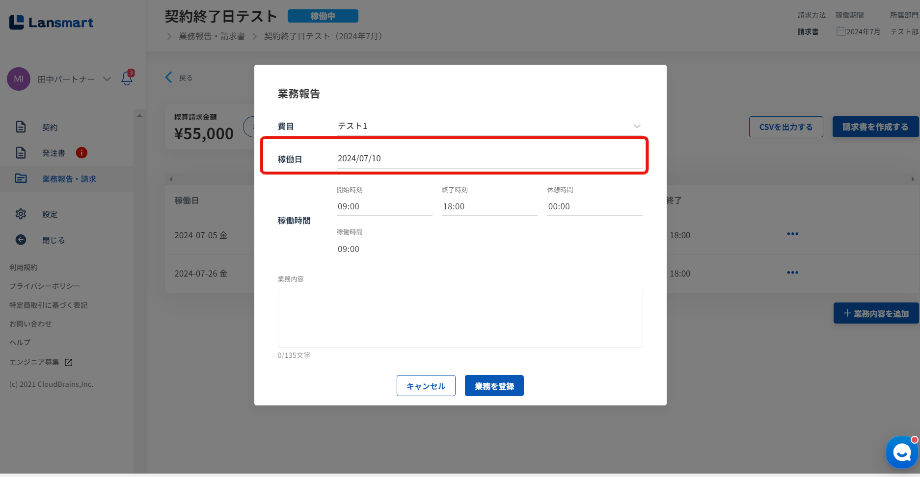 業務登録の稼働日として登録できる日は、役務提供開始日以降役務提供終了日までとなっております。