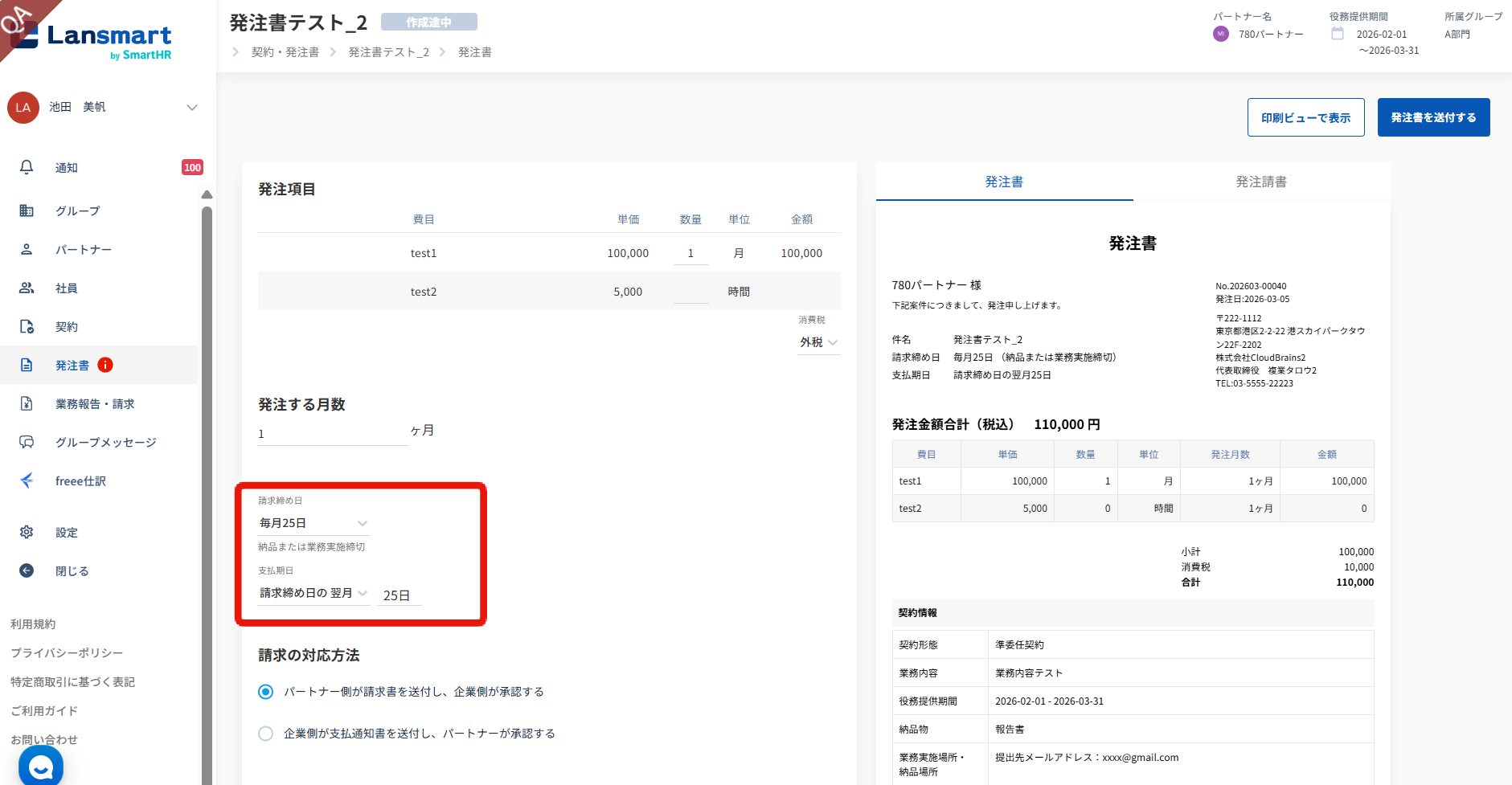 発注書の締め日および支払期日は、契約形態ごとに以下の内容がデフォルト設定となっています。