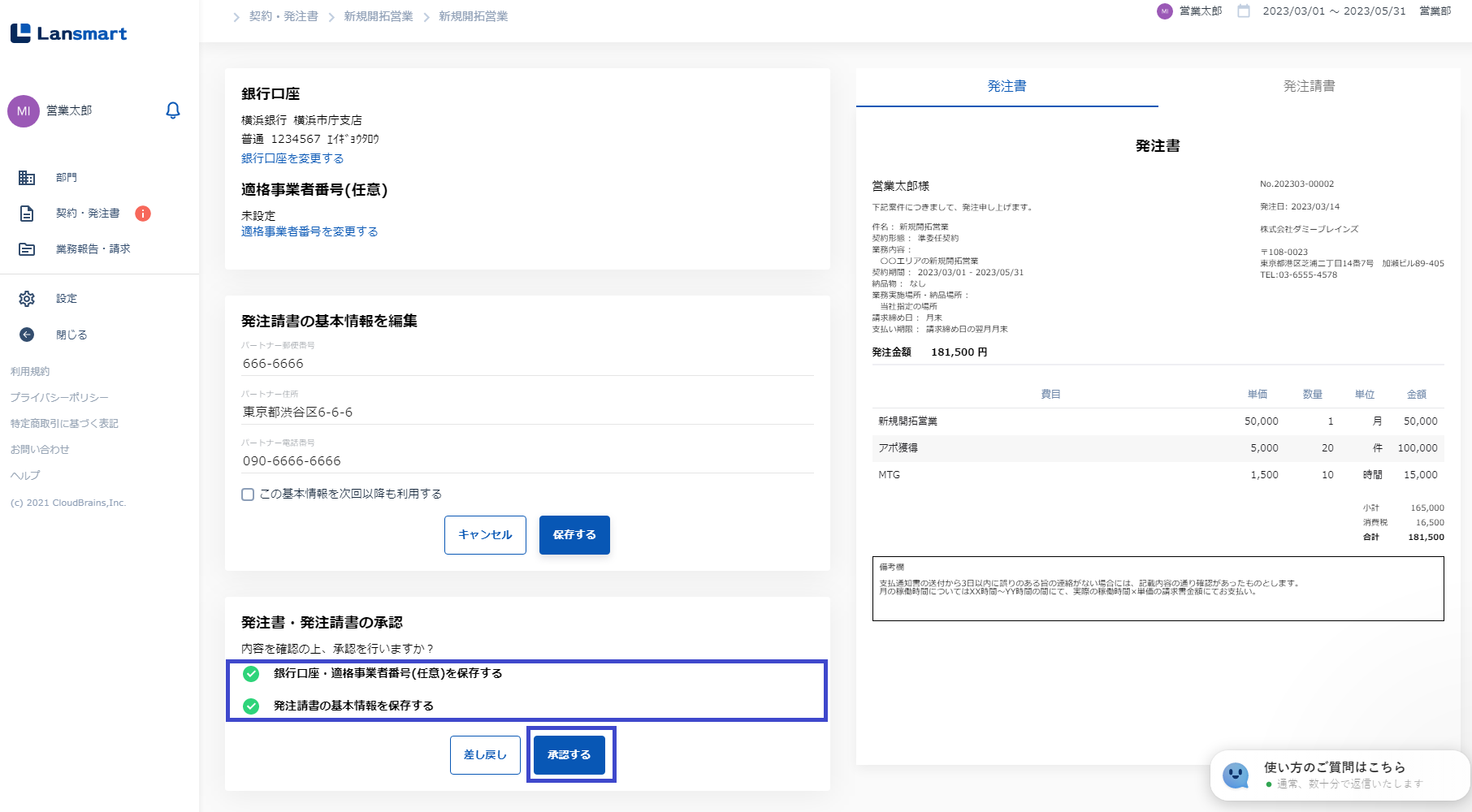 ②発注請書の基本情報の保存 住所と電話番号を入力して「保存する」ボタンを押します。(住所と電話番号は設定画面で登録されている場合には、登録情報が自動で反映されています。) 入力した情報は、画面右側の「発注請書」にも反映されます。 ※「保存する」ボタンは必ず押してください。「保存する」ボタンを押していただきませんと、「承認する」ボタンが押せないようになっています。