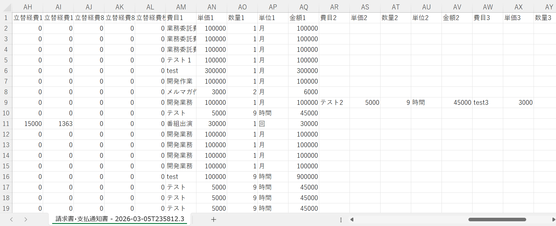 以下の項目に該当する立替経費がない場合、CSVでは「0」が出力されます。