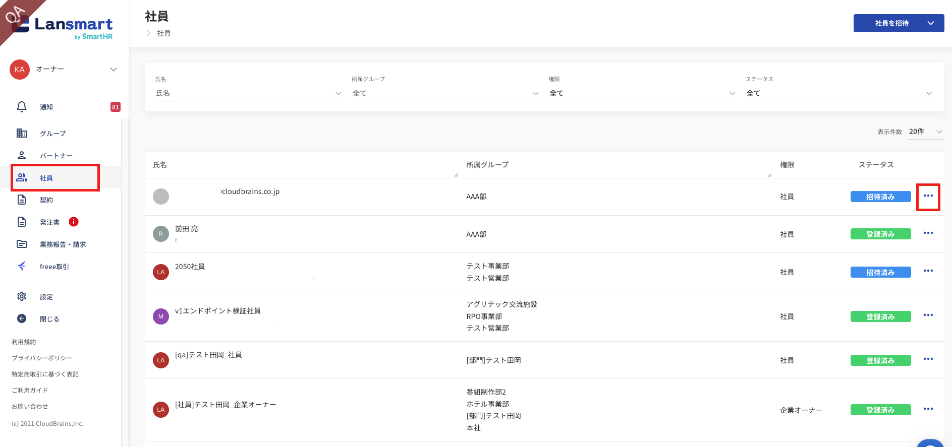 左メニューの「社員」をクリックし、各社員の右側にある三点リーダーから変更を行います。