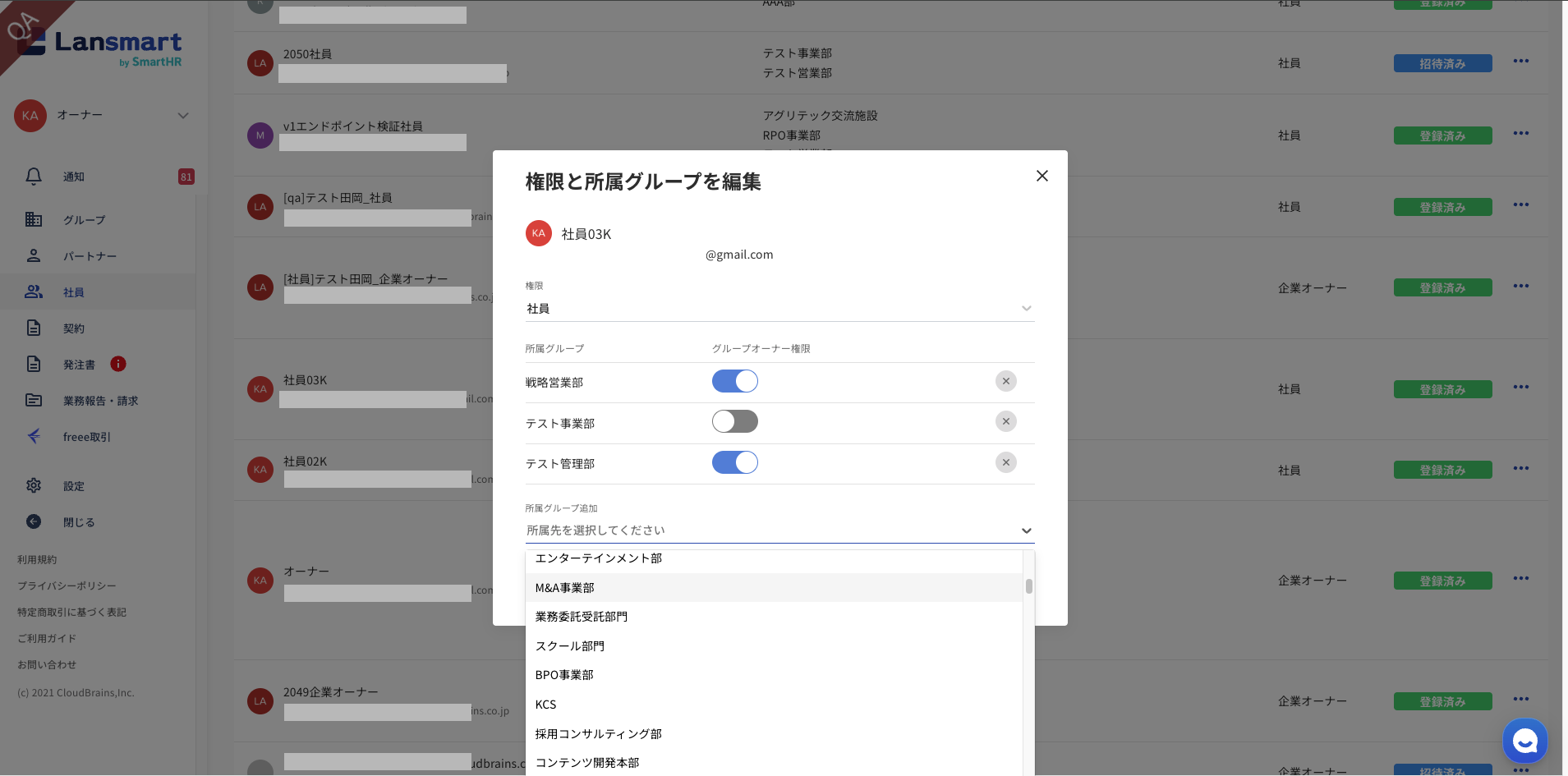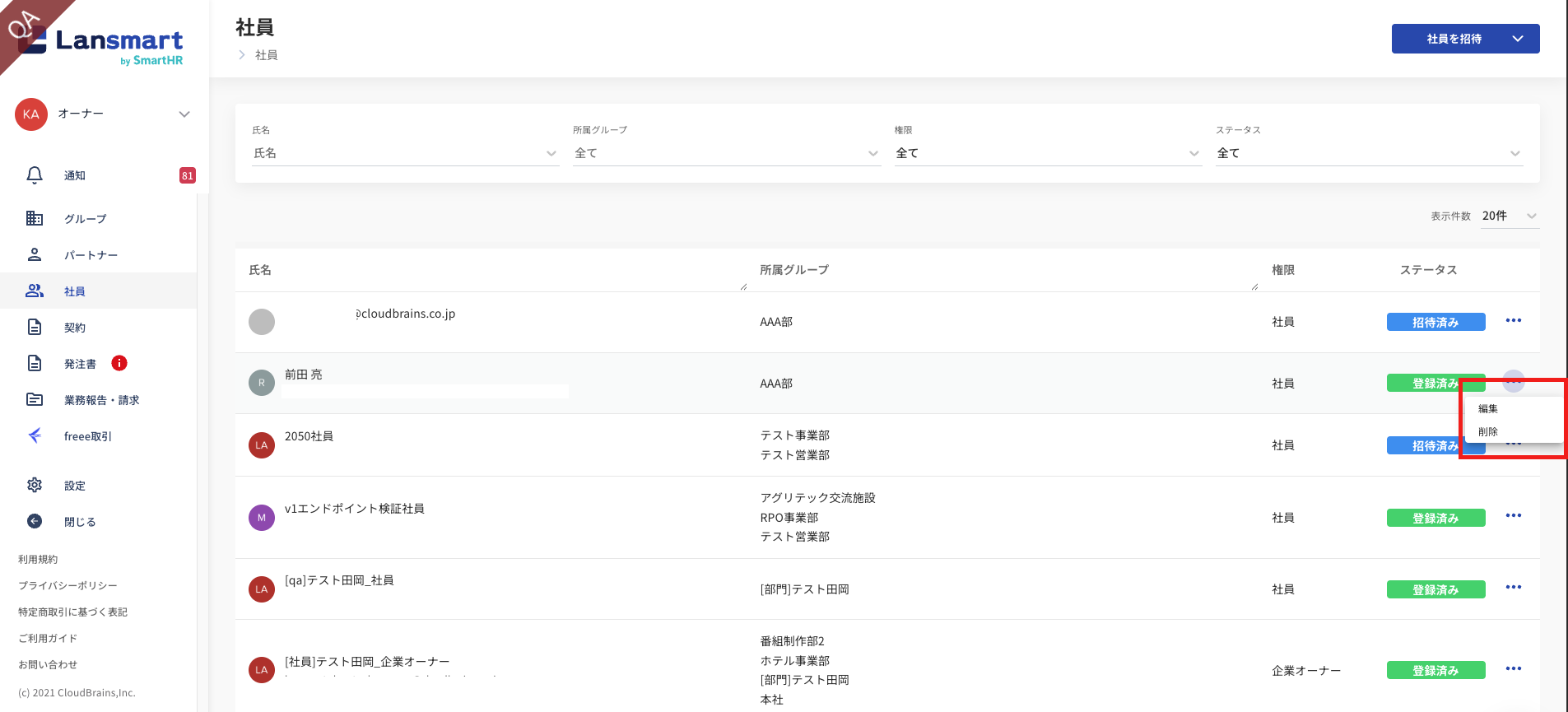 このページでは、グループに招待した社員の編集方法について説明しております。