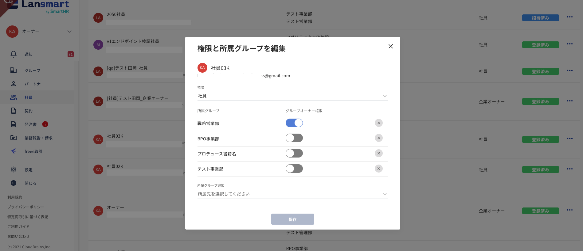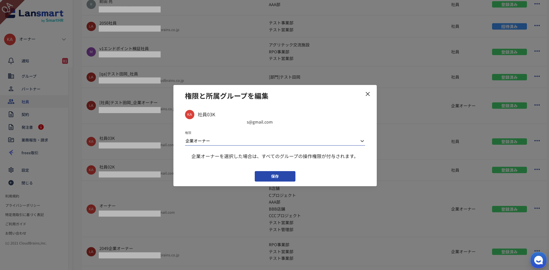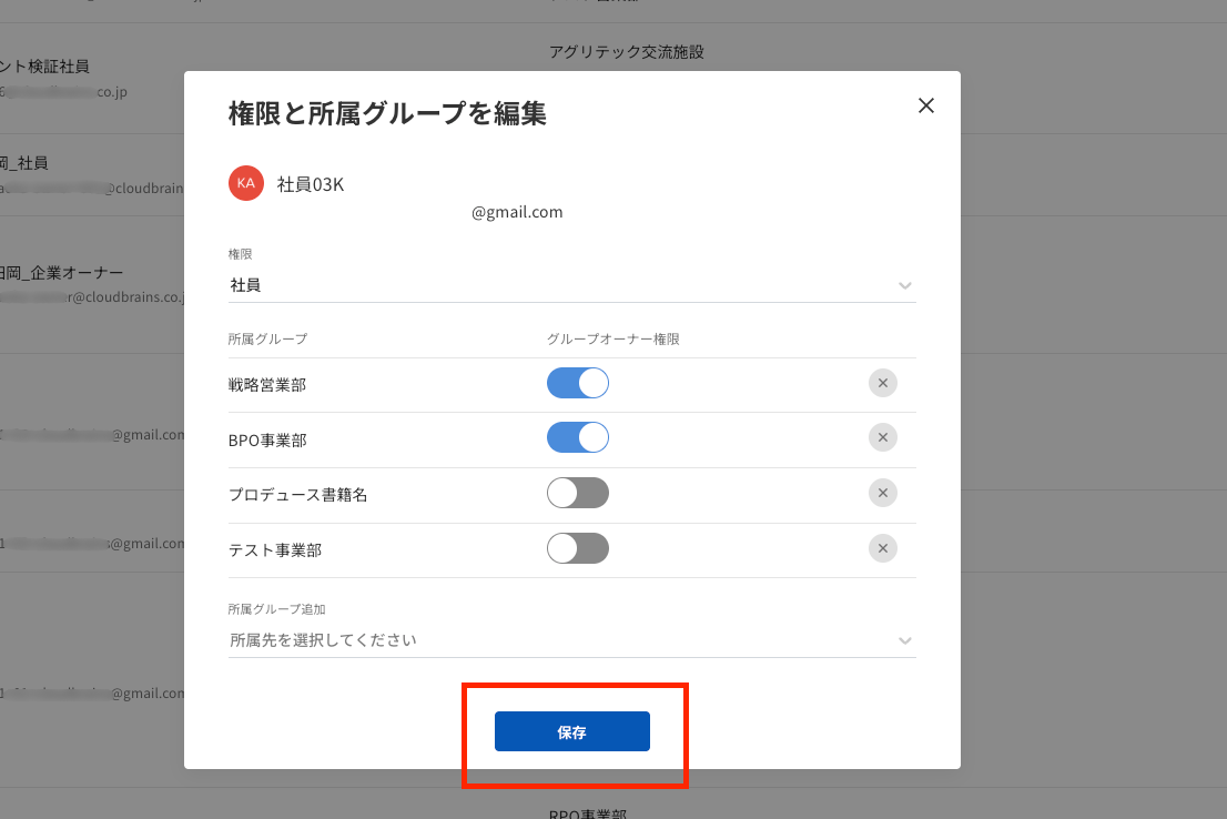 権限の変更や、所属グループの追加や削除を行うとボタンが有効になりますので、保存ボタンを押せば変更完了です。