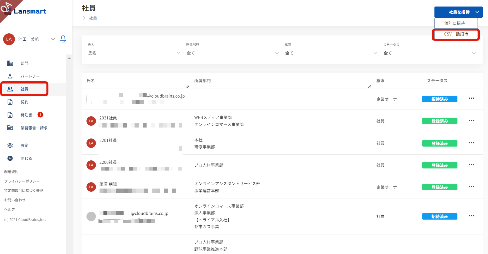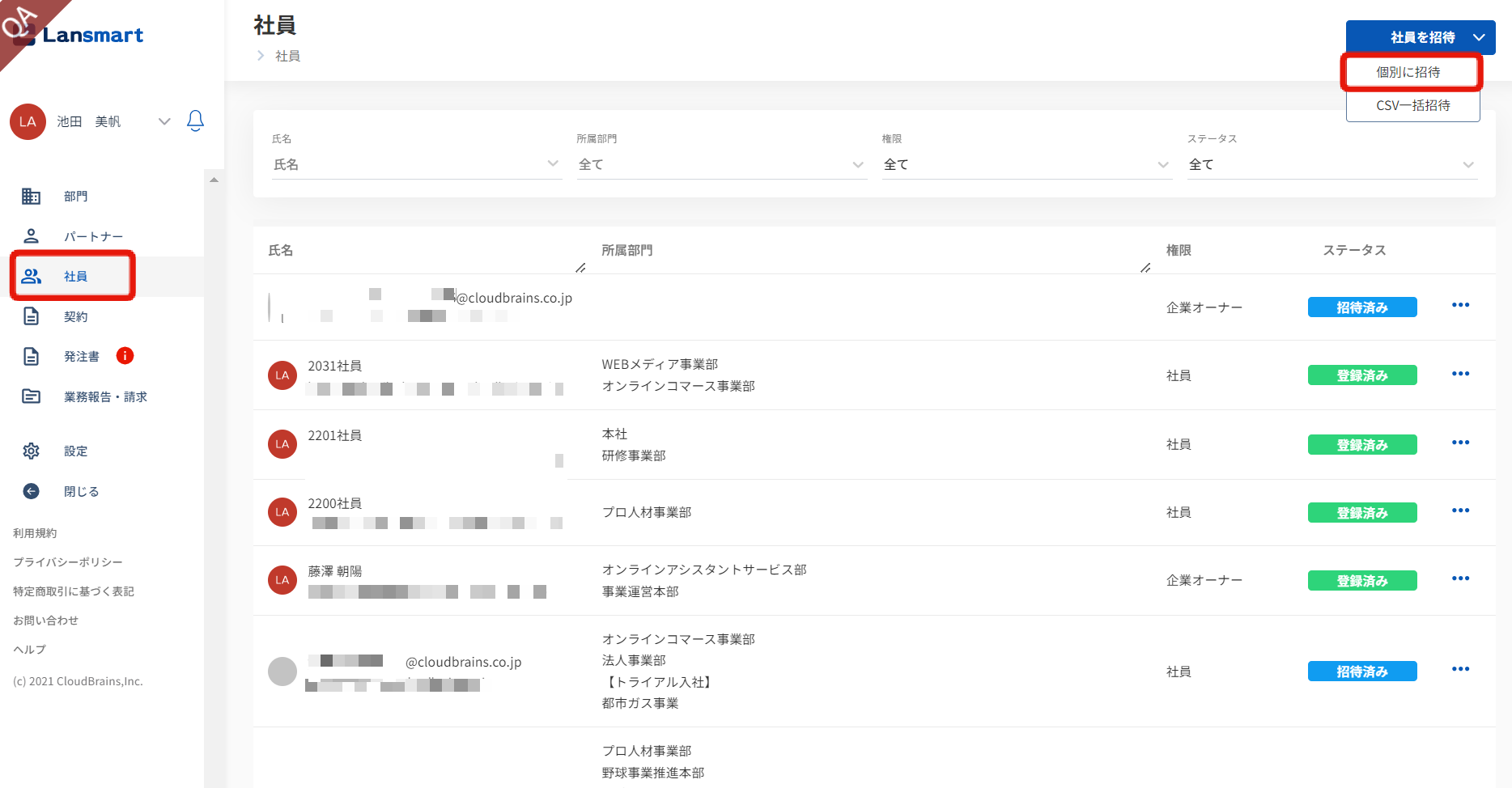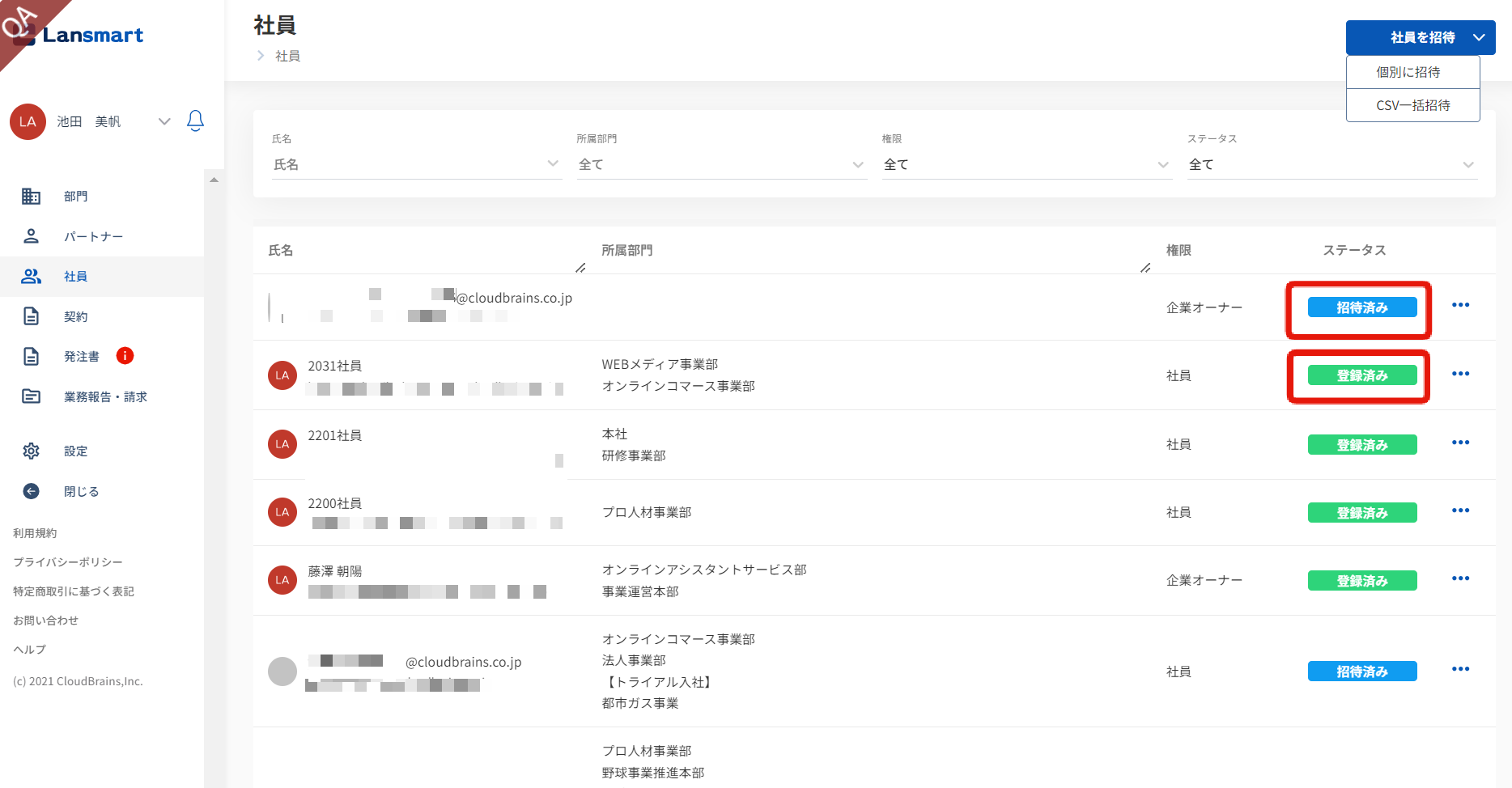 社員の方が、招待メールからユーザー登録を完了されますと「登録済み」ステータスに変更されます。