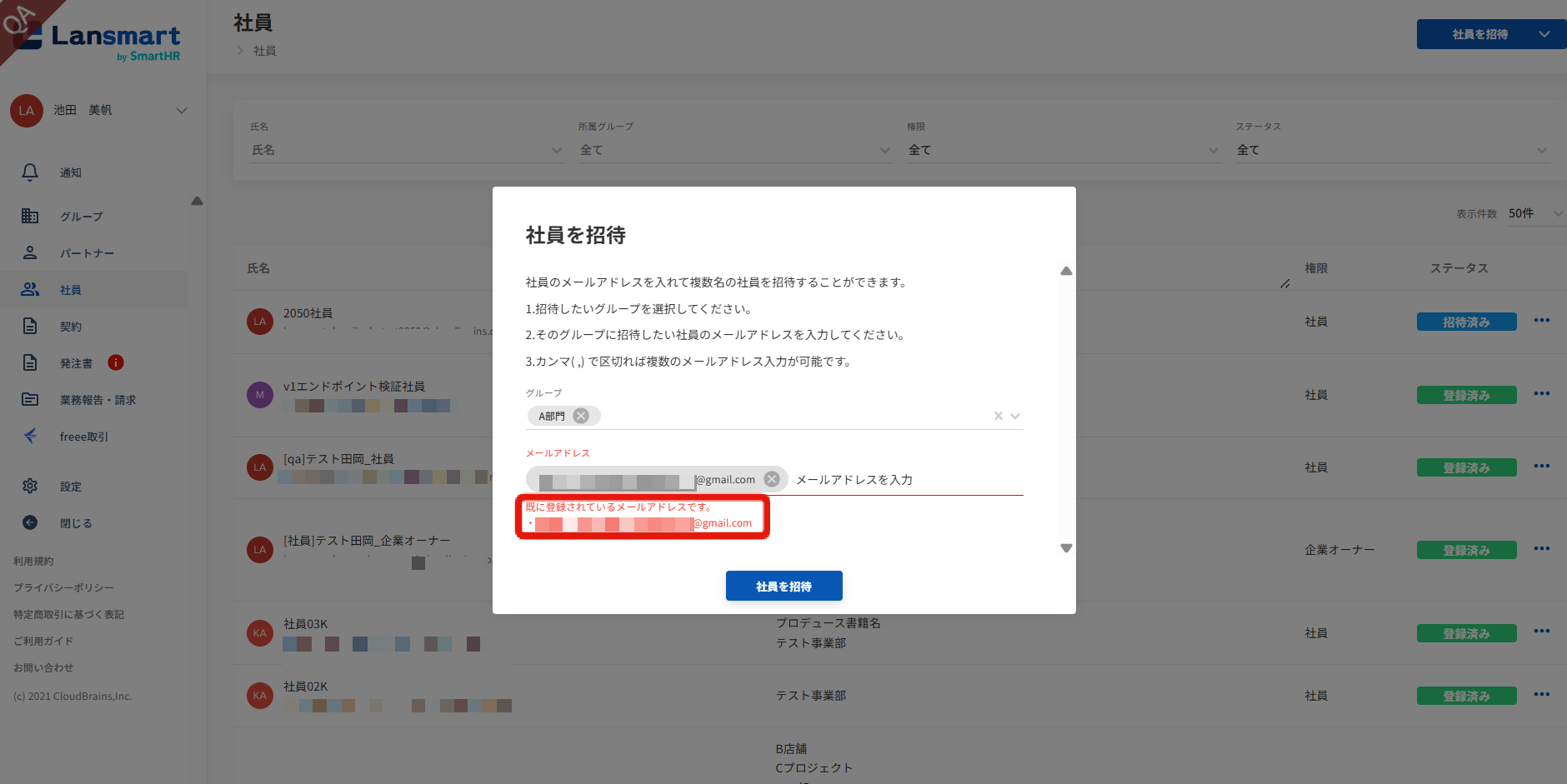 ※招待時に既にユーザー登録済みのパートナーを入力した場合は、招待モーダルに「既にユーザー登録済みです」と表示が出ます。 (招待済みステータスのパートナーはアラートは出ず、再招待することができます。)