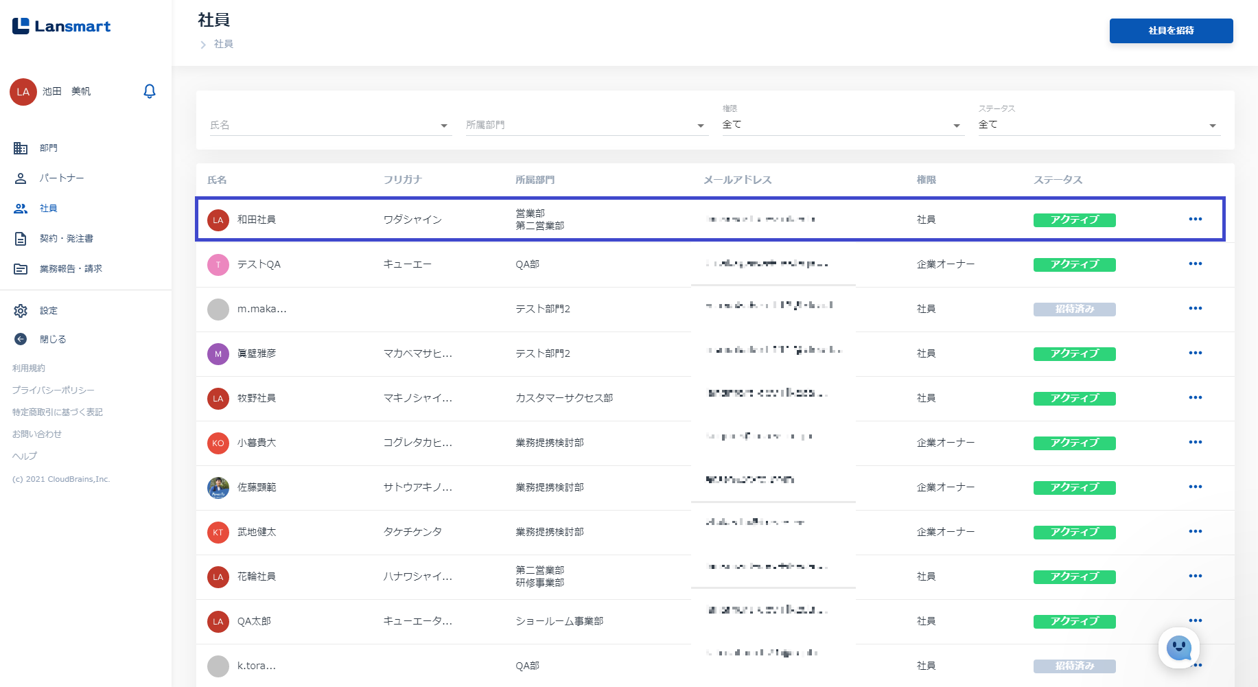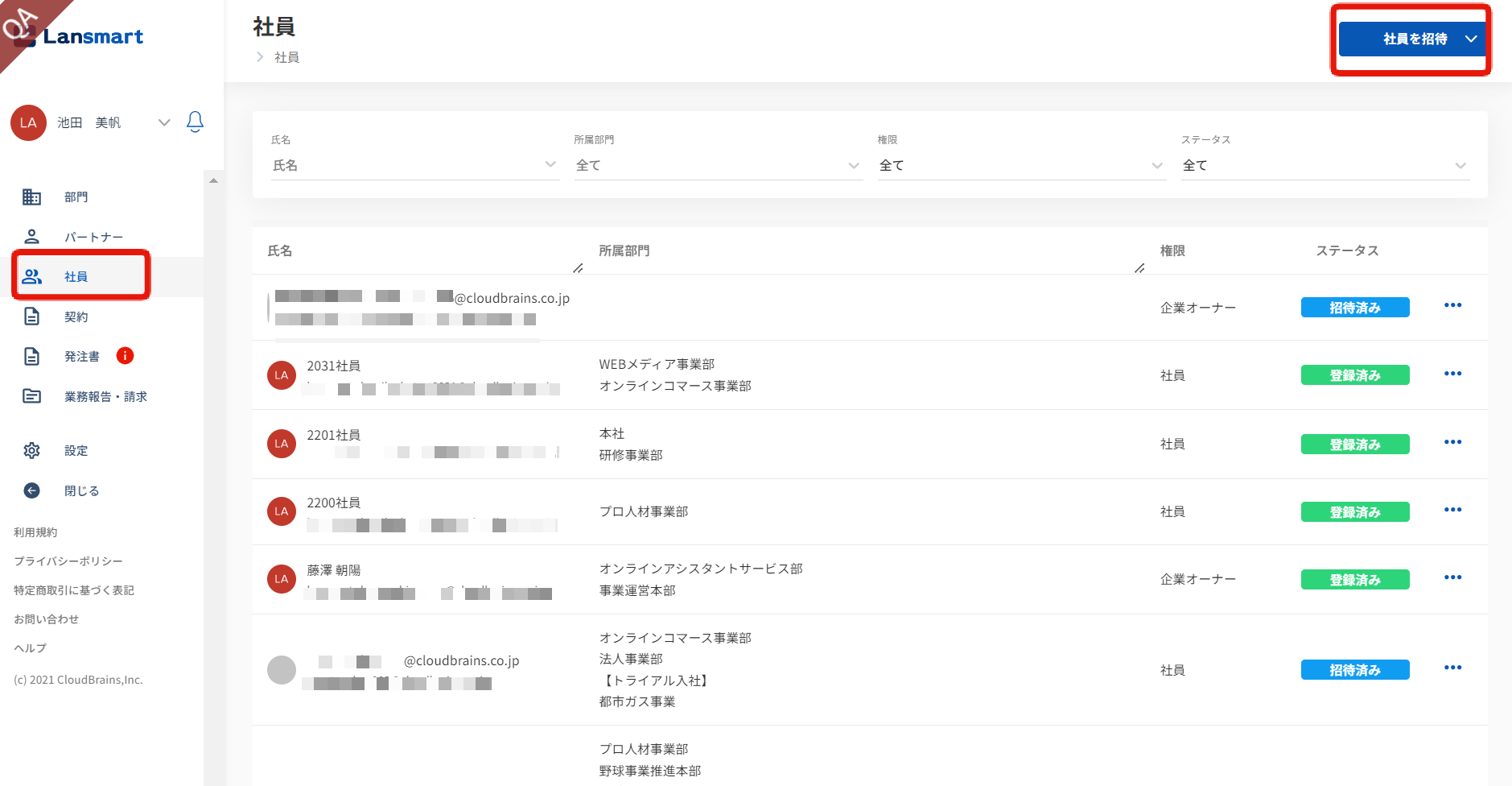 左メニューの「社員」をクリックし、社員一覧画面右上の「社員を招待」から招待を行います。