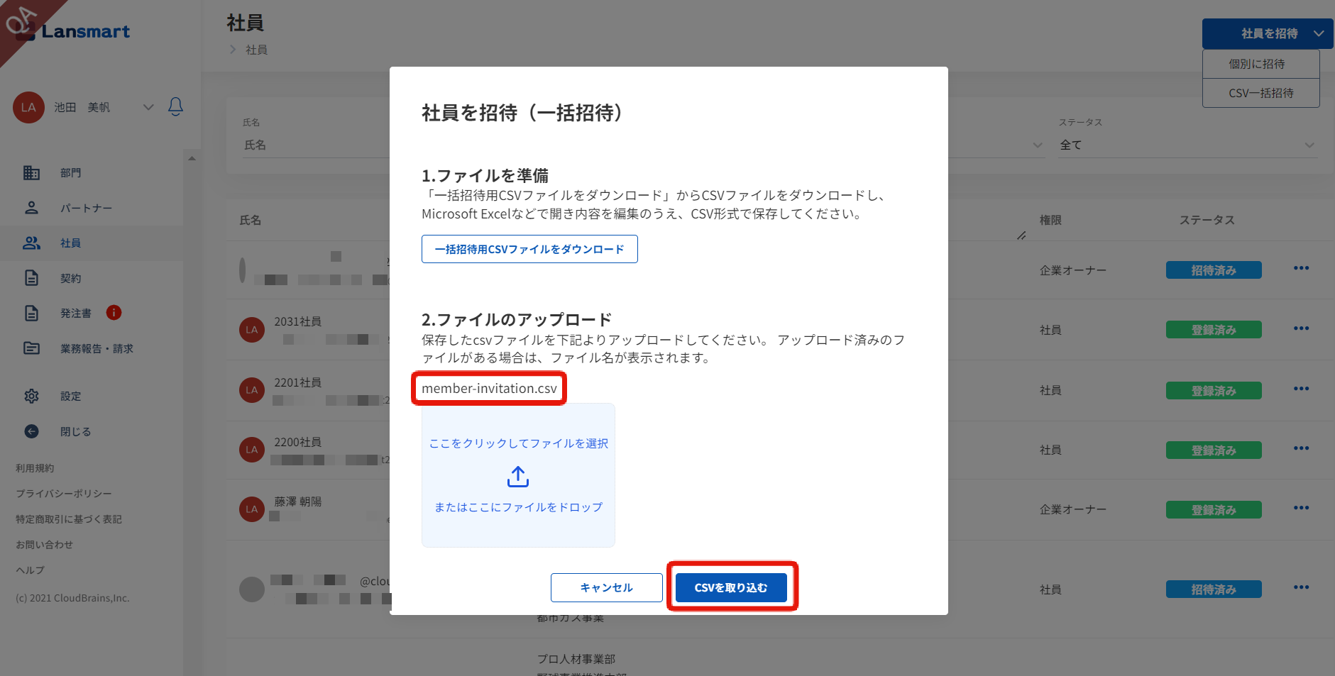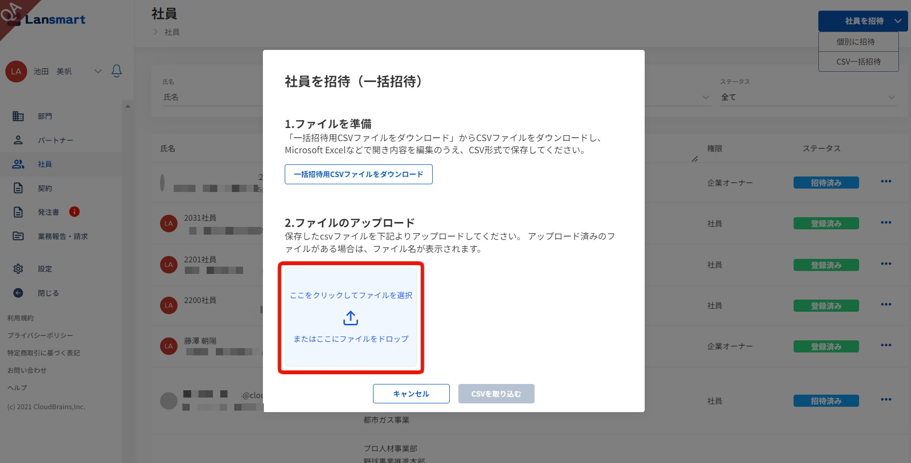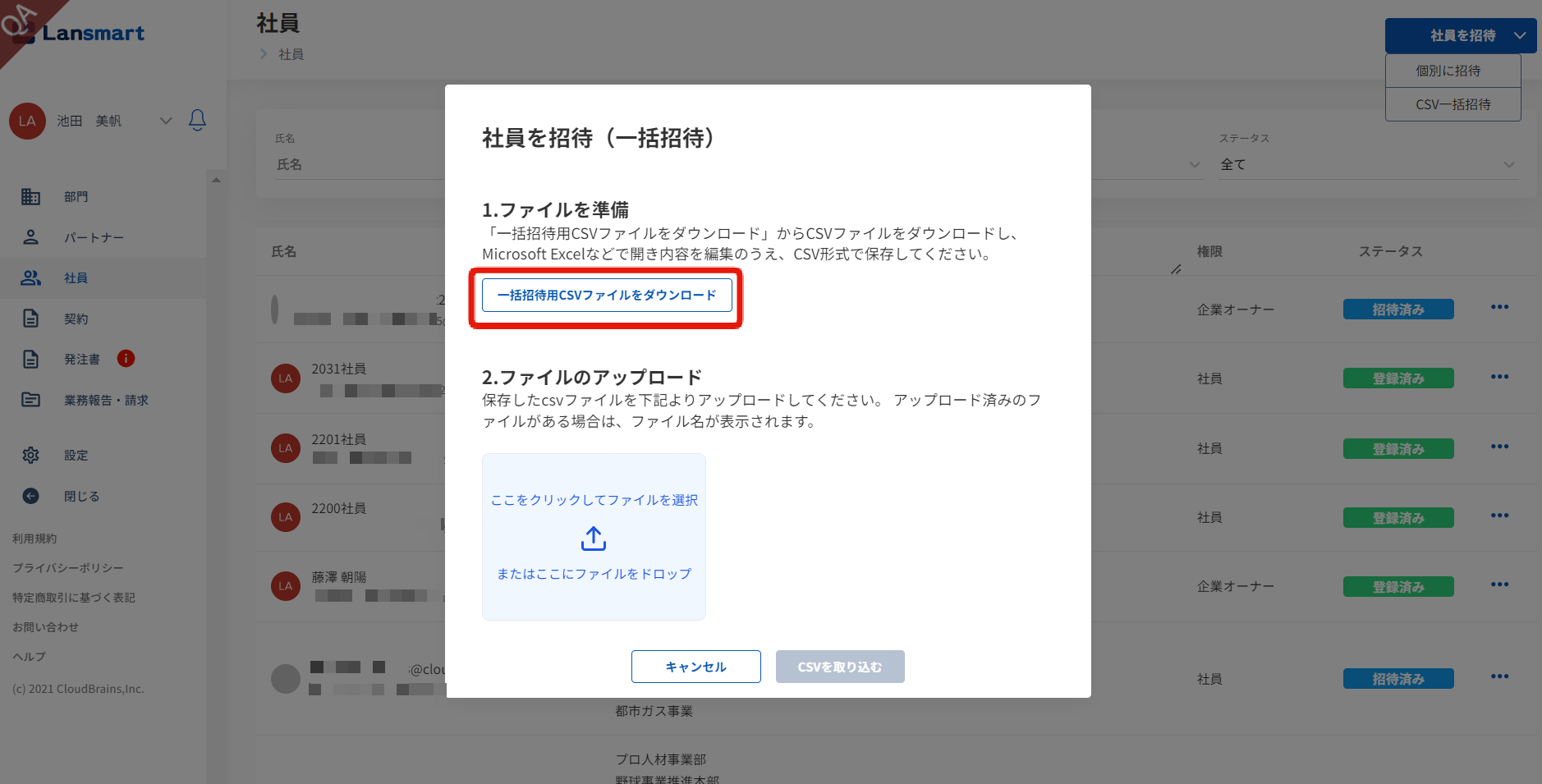 「社員を招待」をクリックし、「CSV一括招待」をクリックします。