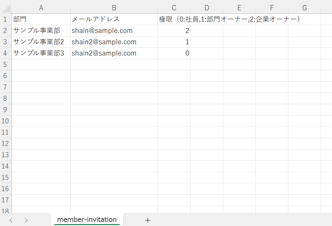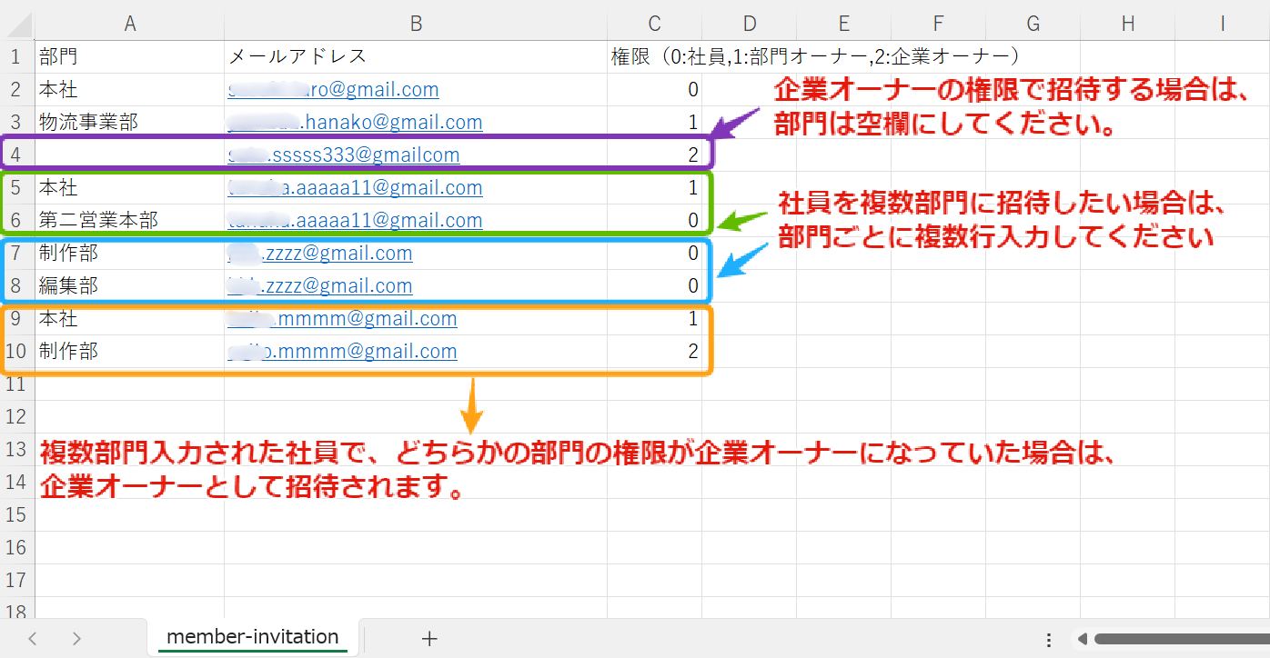社員の方を複数グループに招待したい場合は、グループごとに複数行入力してください。