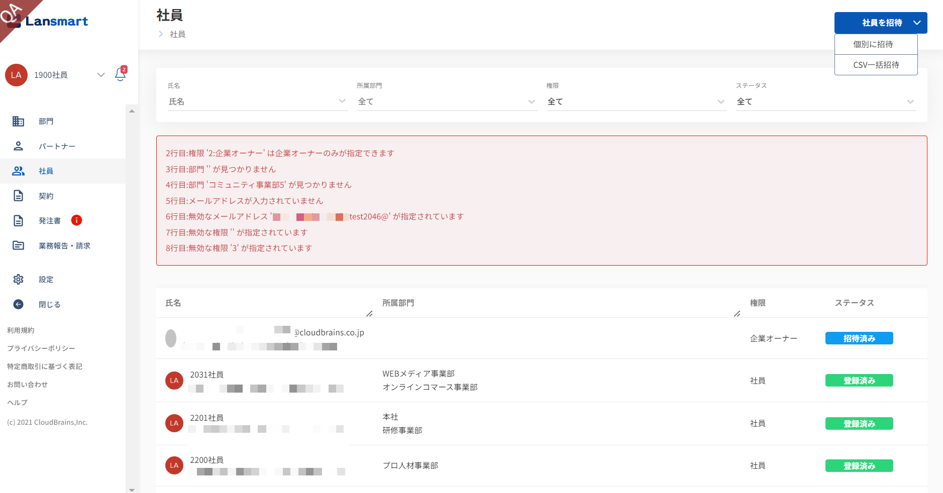 複数グループ入力された社員で、どちらかのグループの権限が企業オーナーになっていた場合は、企業オーナーとして招待されます。