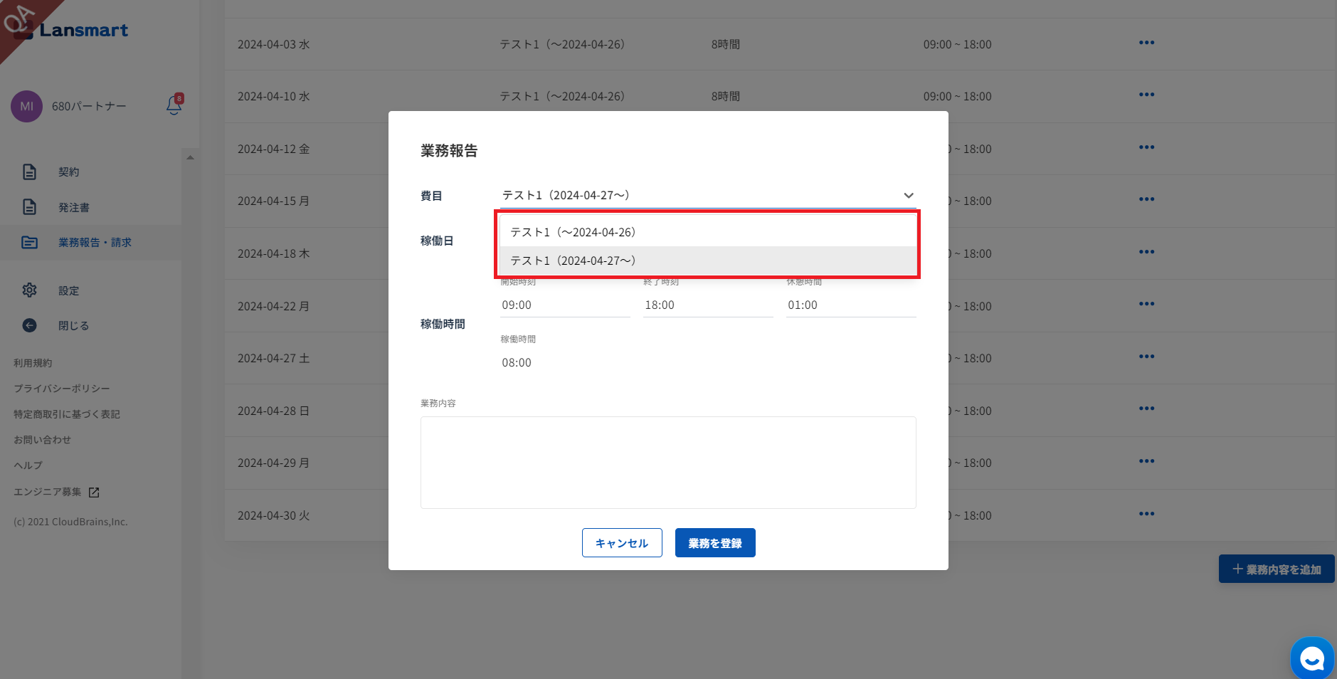 発注書承認後、業務登録は、稼働条件の適用されている日付に応じて、適切な費目が表示され選択できるようになっております。