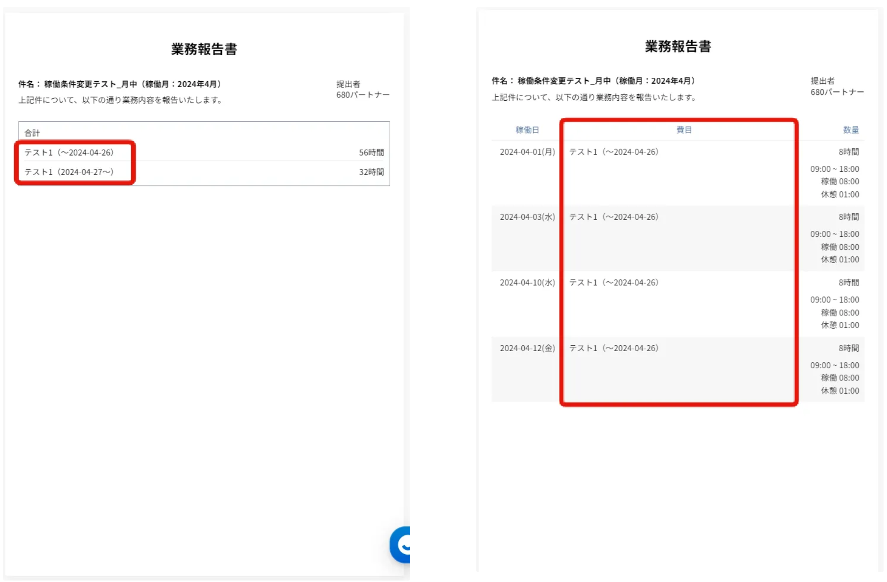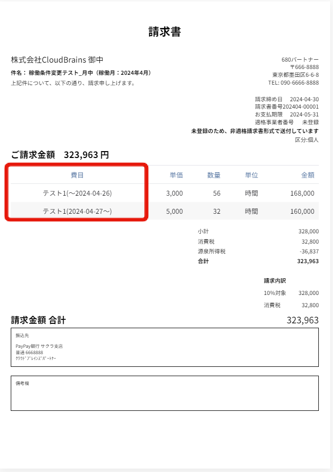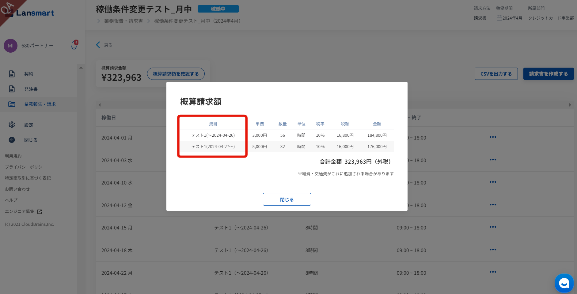 例)締め日が末日の場合、2024/4/27を稼働条件変更日として、費目「テスト1」の単価を3,000円から5,000円に変更する