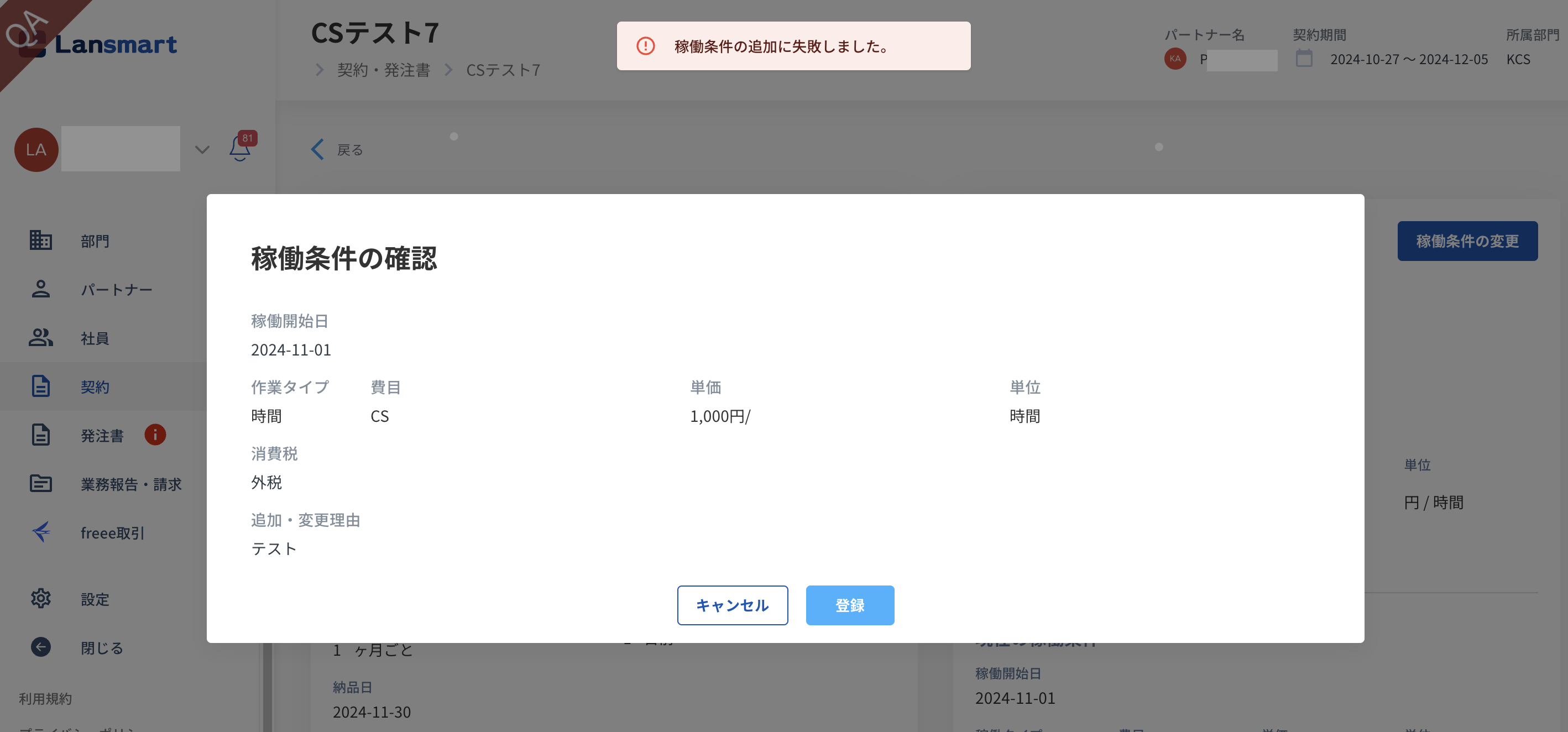 稼働条件に設定した日付以降の日付でパートナー様が既に業務登録をされている際は、稼働条件変更を行うことができず以下添付のようなエラー画面が表示されます。