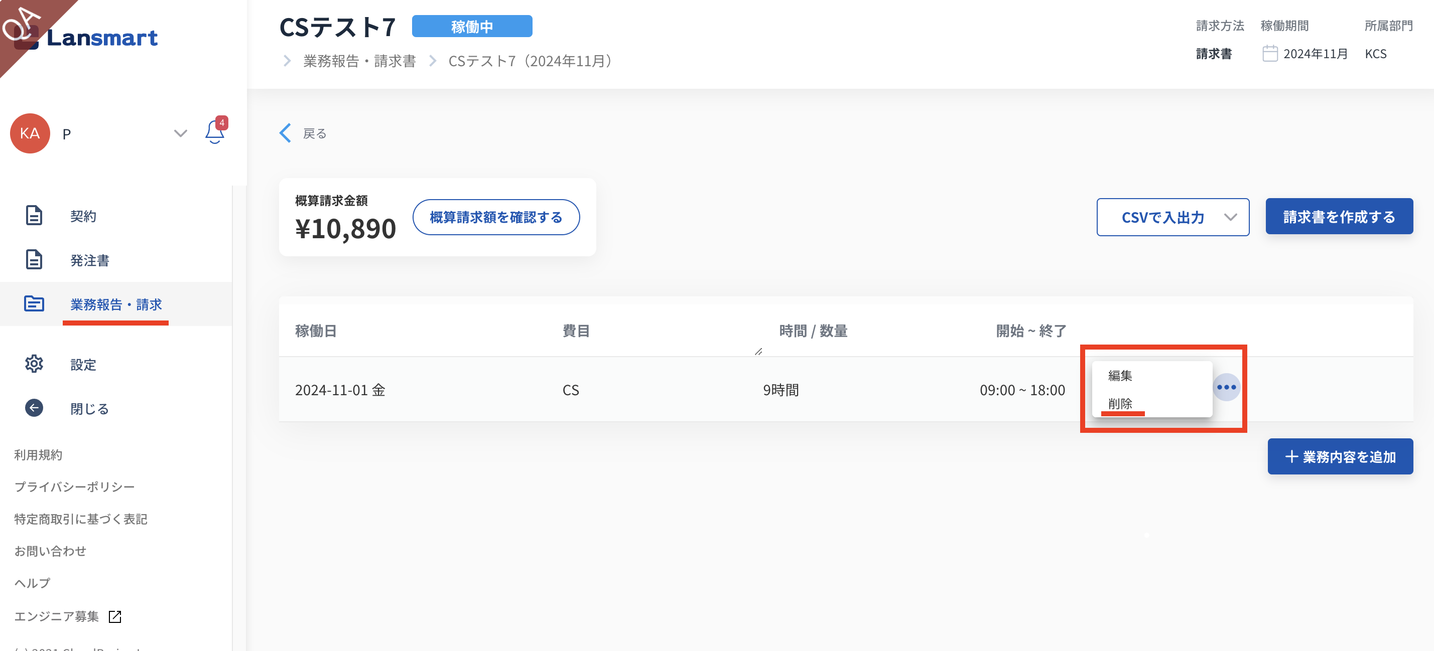 ※パートナー様には、稼働条件変更後、再度業務登録いただくことになりますので、現在の業務報告にて業務登録のCSV出力をご案内してください。 ダウンロードされたCSVを使って、新たな業務報告でCSV一括登録が可能です。