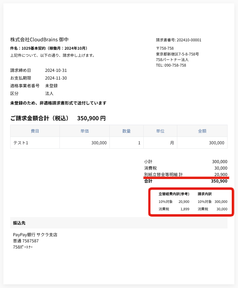 請求書の「請求内訳」には、立替経費・交通費を含めた金額が表示されます。