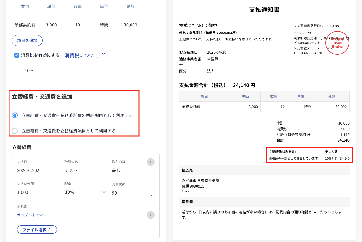 支払通知書の「請求内訳」には、立替経費・交通費を含めた金額が表示されます。