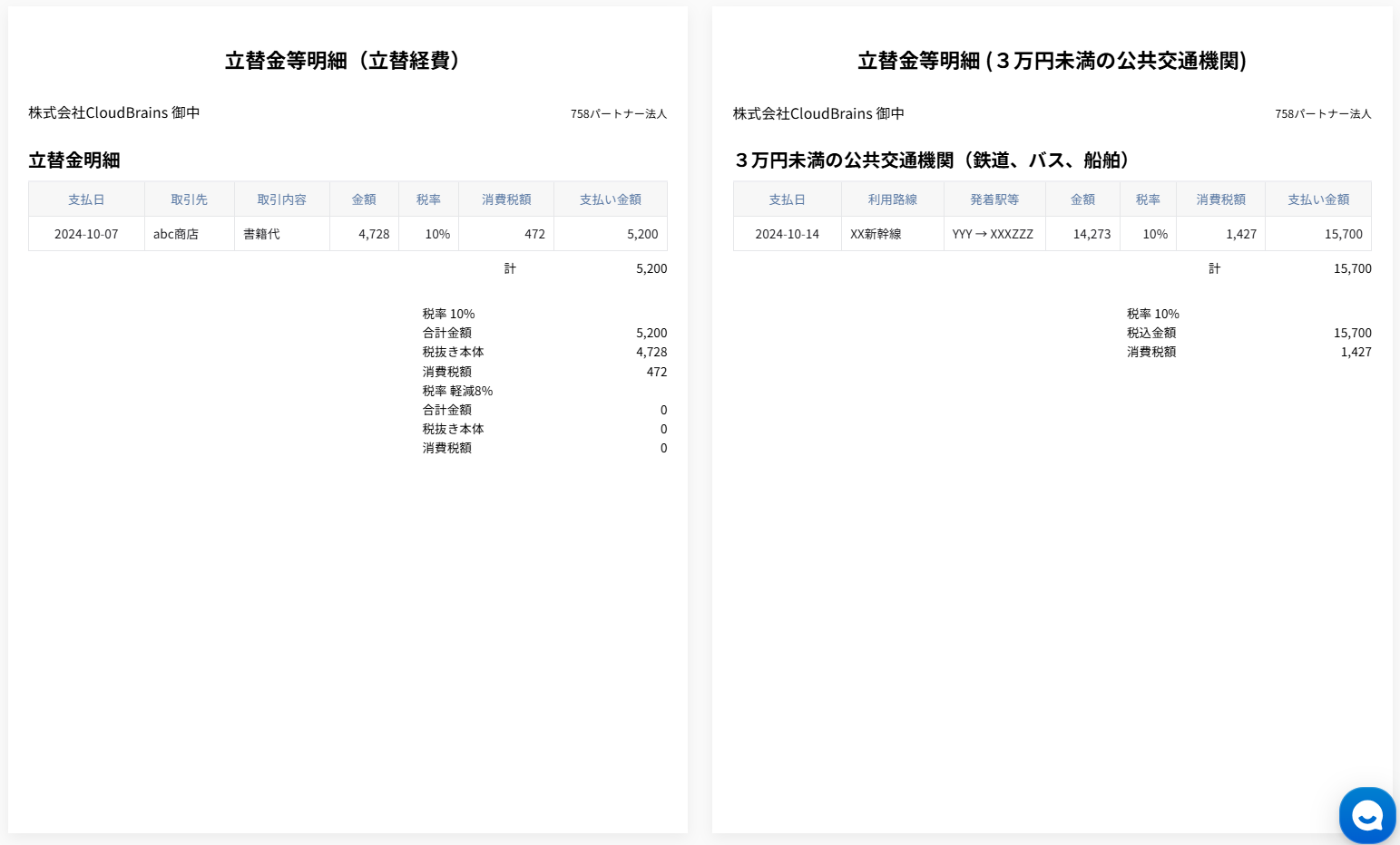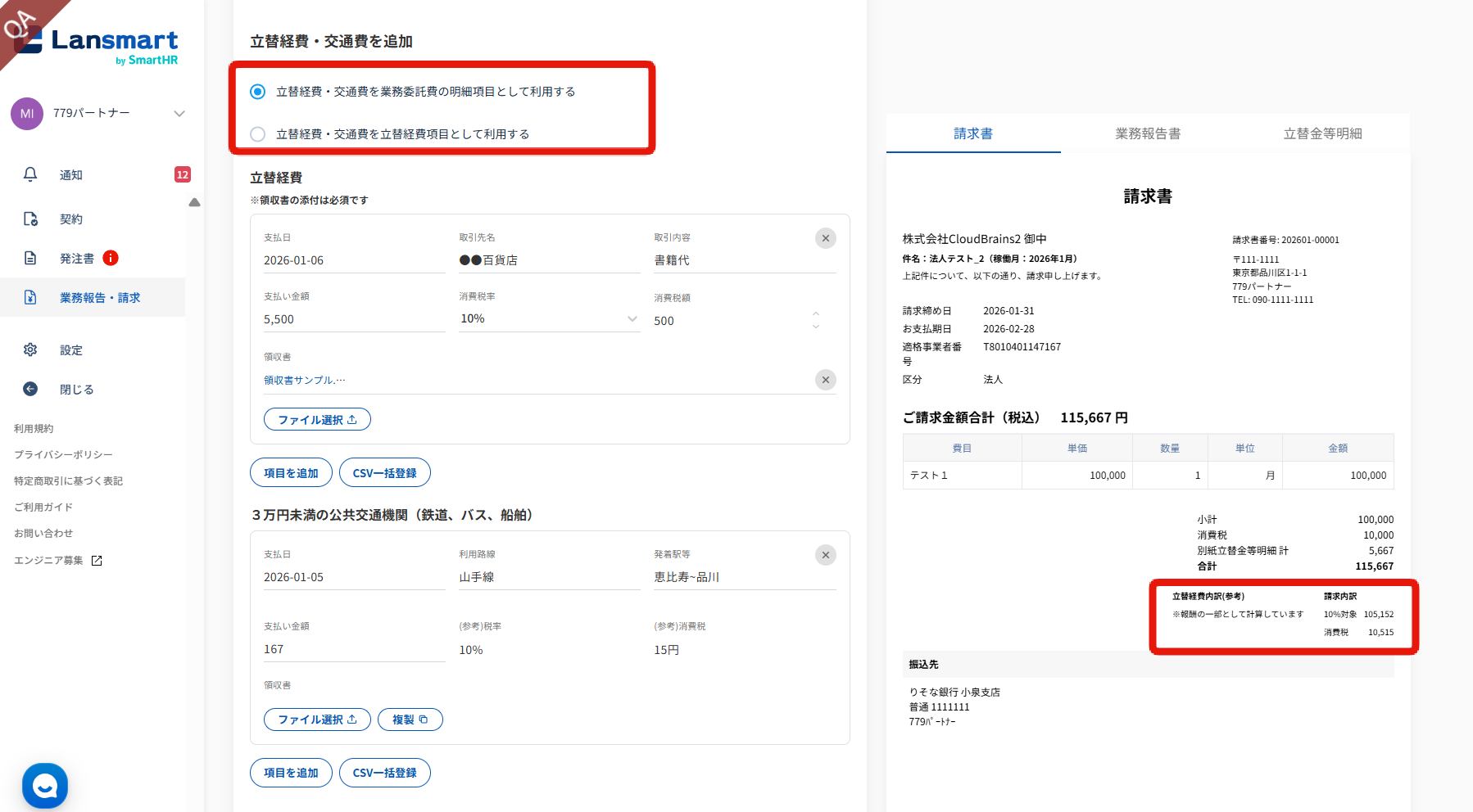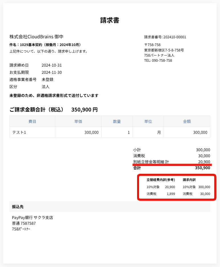 • 請求書の「請求内訳」には、立替経費・交通費を含めた金額が表示されます。