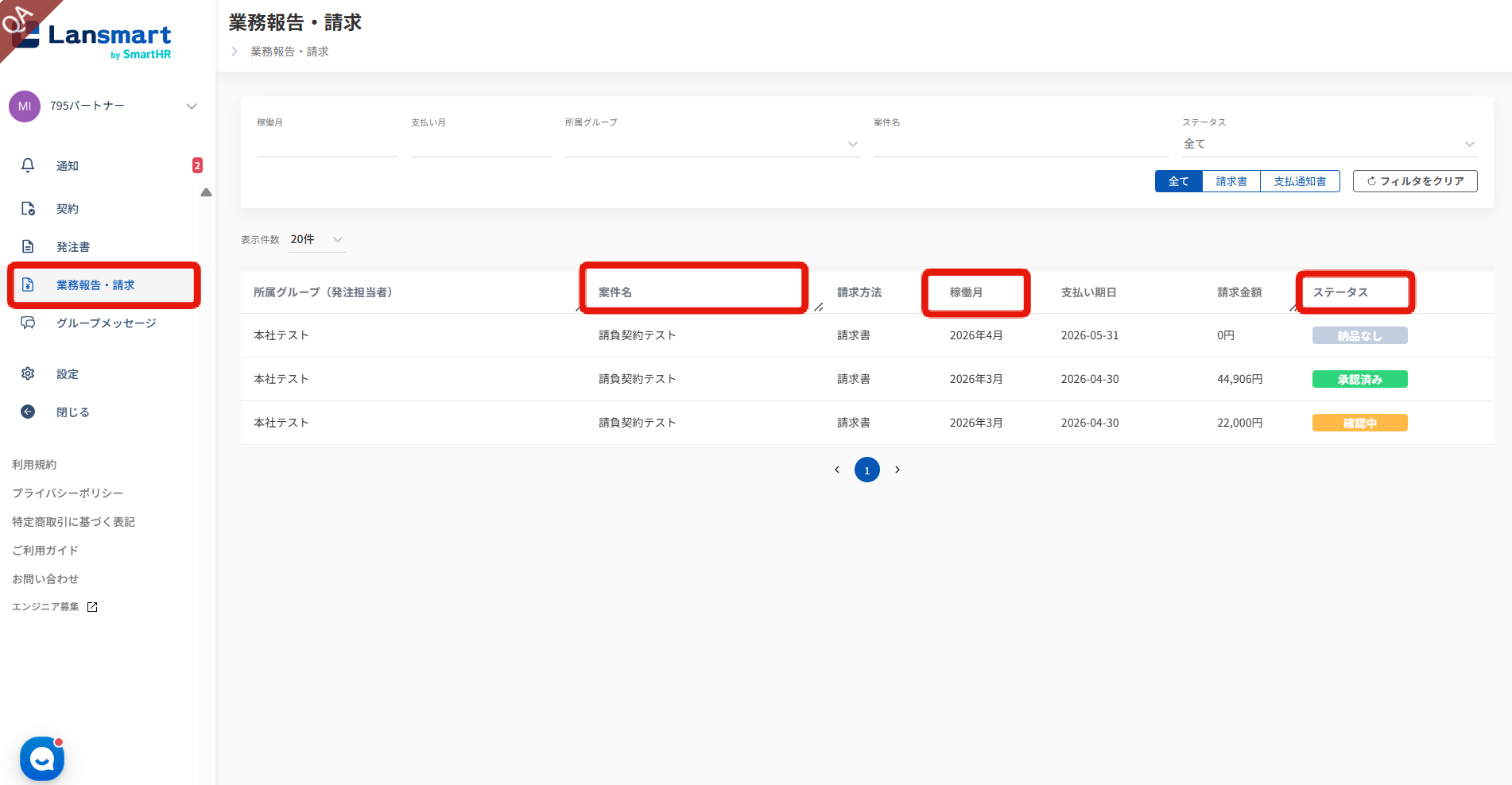 左メニューの「業務報告・請求」から、一覧に表示されている業務報告をクリックします。