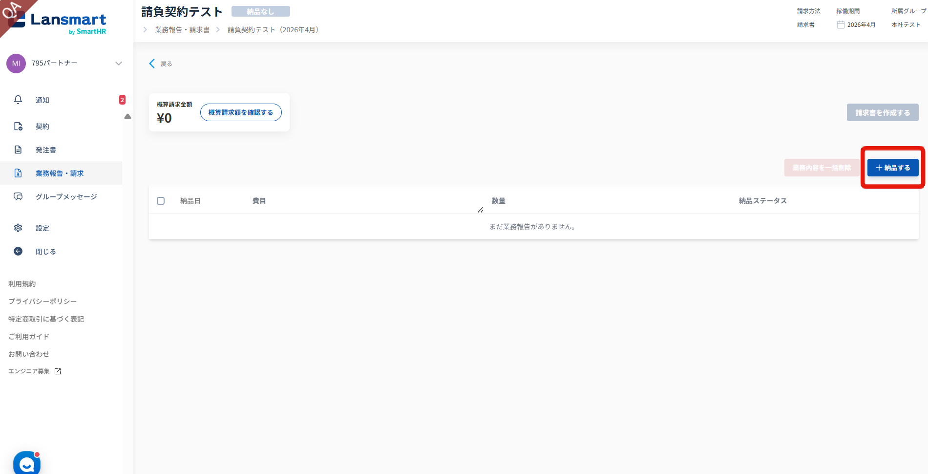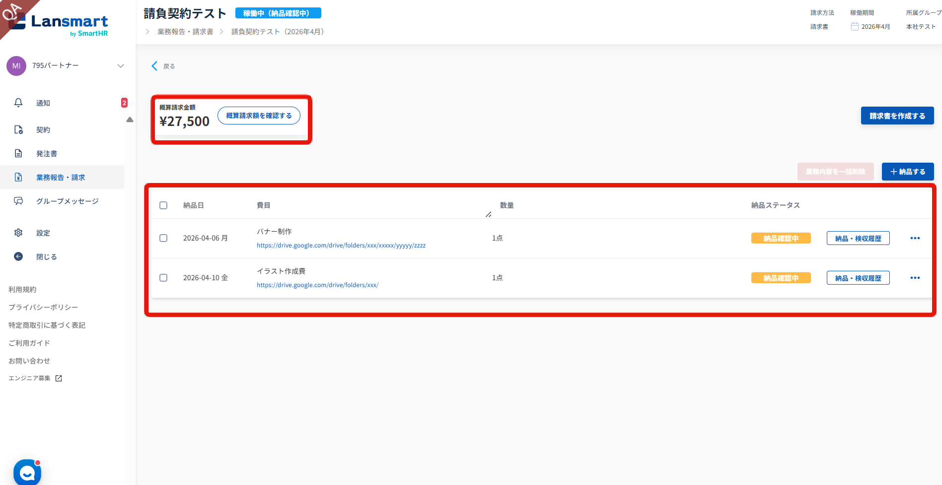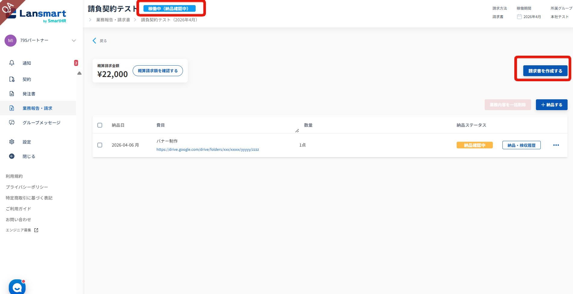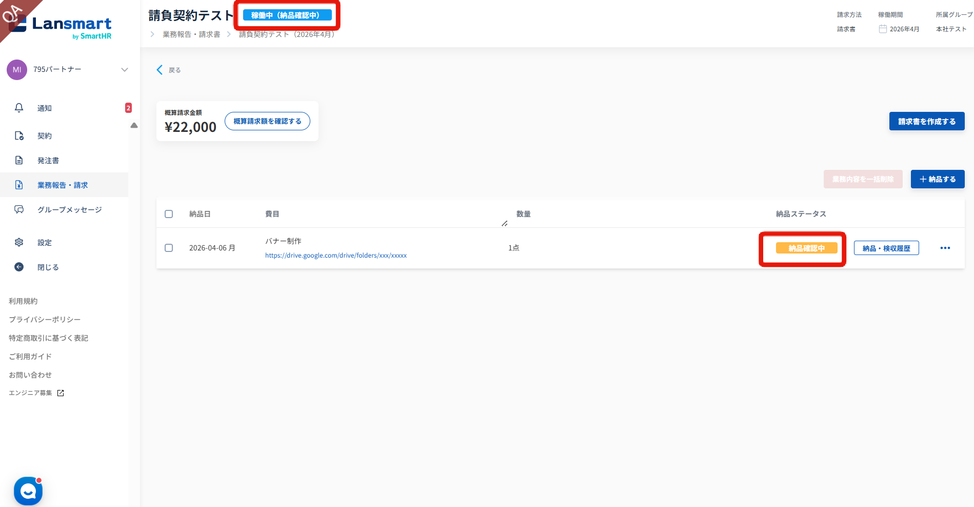 納品が1件以上登録されていれば、企業様が検収をされていない状態でも請求書の提出が可能です。