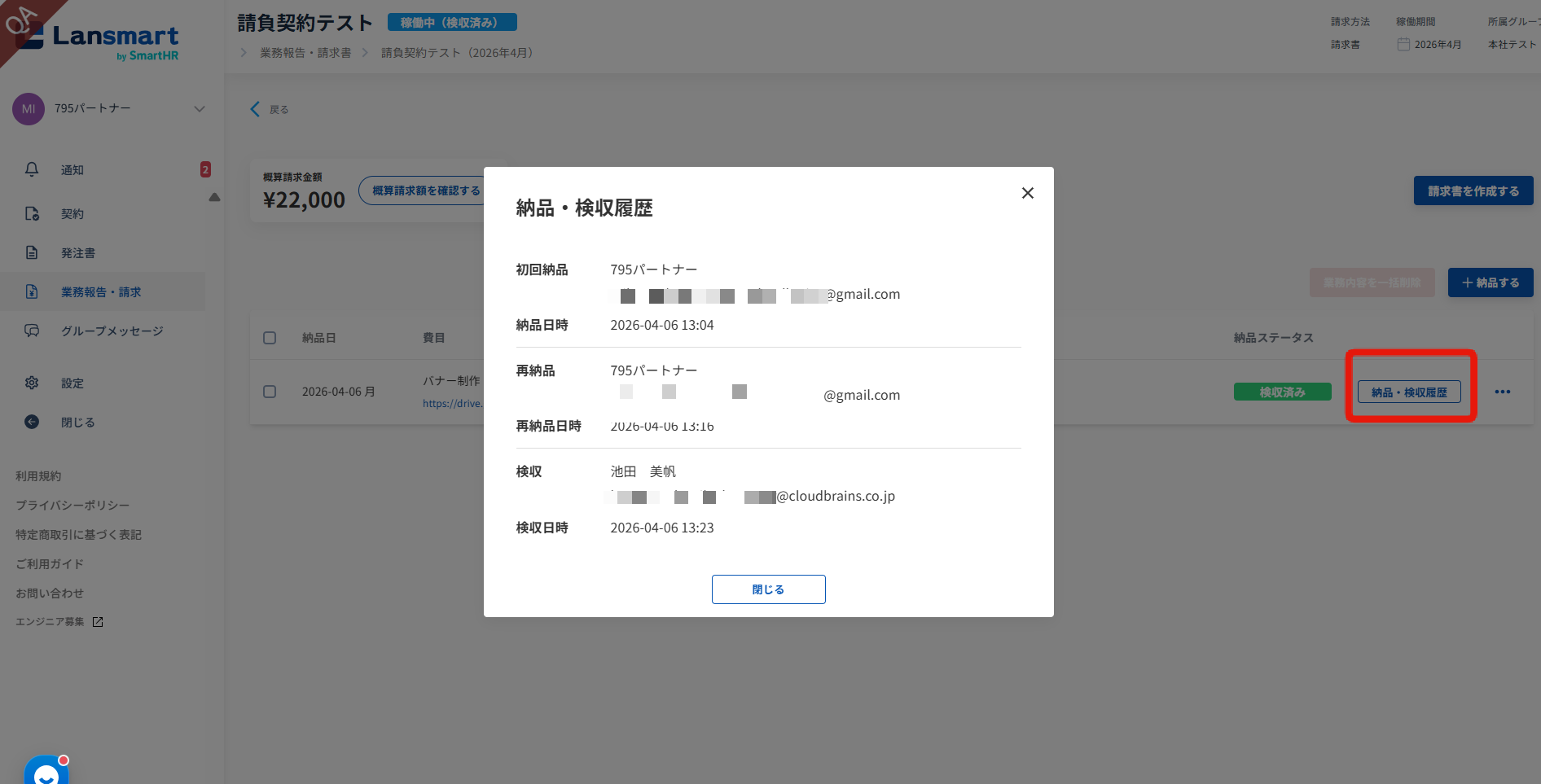 発注書の承認が完了すると、納品登録をLansmart by SmartHR上で行えるようになります。この納品登録のデータをもとに納品書と請求書が自動で生成されます。