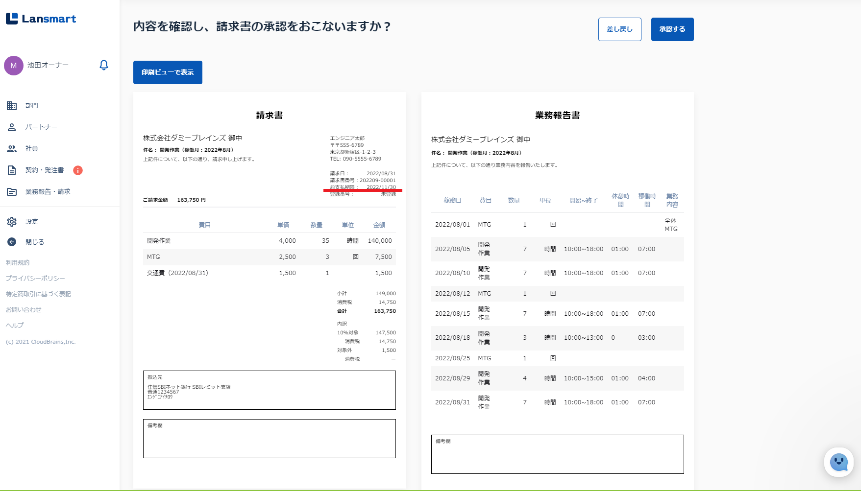 ②請求書の支払期日の確認をお願いいたします。 請求書の支払期日が過去日になっている場合は、承認することができません。 Lansmart by SmartHR画面右下のお問合せチャットより、ご連絡をお願いいたします。 弊社で請求書を差し戻しできる状態にし、パートナー様に支払期日の変更対応をお願いいたします。