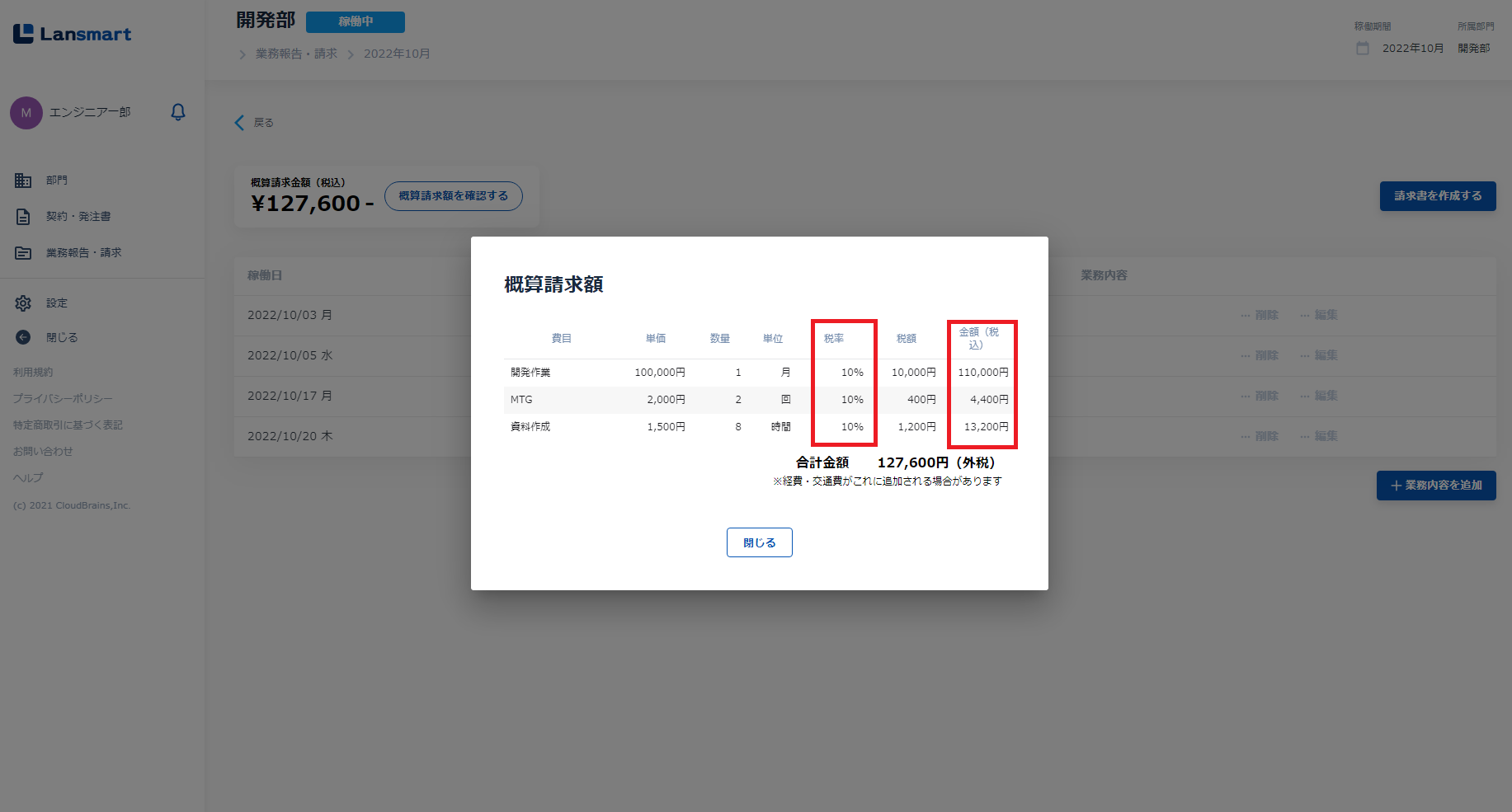 Lansmart by SmartHRでは、パートナー様が業務登録を入力すると、その入力情報をもとに請求金額が自動で計算されます。(消費税率は一律10%としています。)